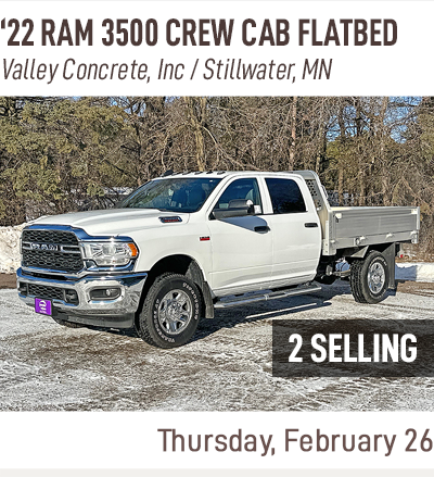 SOLD! February 04 Ag Equipment Auction, Thursday February 05 Truck and Trailer Auction, Wednesday February 11 Vehicles and Equipment Auction, Thursday February 12 Construction Equipment Auction, Tuesday February 17 Government Auction, Wednesday February 18 Ag Equipment Auction, Thursday February 19 Truck and Trailer Auction, Wednesday February 25 Vehicles and Equipment Auction, Thursday February 26 Construction Equipment Auction, Tuesday March 03 Government Auction, Wednesday March 04 Ag Equipment Auction, Thursday March 05 Truck and Trailer Auction