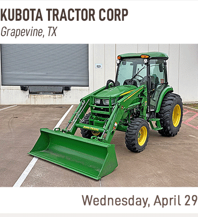SOLD! April 23 Construction Equipment Auction, Tuesday April 28 Government Auction, Wednesday April 29 Ag Equipment Auction, Thursday April 30 Truck and Trailer Auction, Wednesday May 06 Vehicles and Equipment Auction, Thursday May 07 Construction Equipment Auction, Tuesday May 12 Government Auction, Wednesday May 13 Ag Equipment Auction, Thursday May 14 Truck and Trailer Auction, Wednesday May 20 Vehicles and Equipment Auction, Thursday May 21 Construction Equipment Auction, Tuesday May 26 Government Auction, Wednesday May 27 Ag Equipment Auction, Thursday May 28 Truck and Trailer Auction