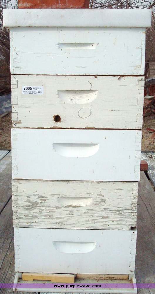 Purple Wave is selling a used Ag Equip. Other in Kansas. This item is a with the following: Complete bee hive. Estimated 2,000 bees. Bottom three boxes are brood nests. Top two boxes are honey surplus with metal queen excluder. 16"W x 22 1/2"D x 36"H. Purple Wave Hays. Hays, KSCondition = 3Sold as pictured, item has not been tested. We have made no attempt to evaluate this merchandise other than picturing it.