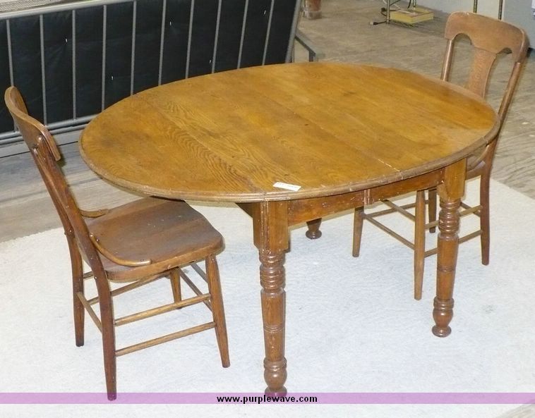 Purple Wave is selling a used Furniture in Kansas. This item is a with the following: Antique table with fold down wings, 43" x 52" . (2) wood chairs. Full Moon Productions. Kansas City, MOCondition = 3Sold as pictured, item has not been tested. We have made no attempt to evaluate this merchandise other than picturing it.