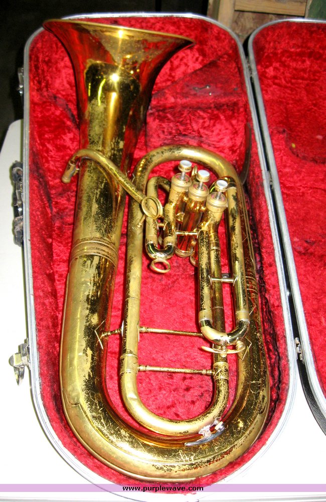Bundy trumpet. Baritone king. Buescher 400 baritone saxophone. Pearl cymbal holder. Property of USD 308. 732 E. 1st. Hutchinson, Ks Condition = 3 Sold as pictured, item has not been tested. We have made no attempt to evaluate this merchandise other than picturing it.