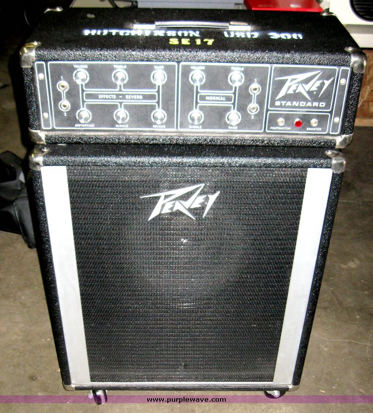 Peavey bass enclosure. Serial no. 7E-063909. Peavey amplifier. 400 watts. 60 hz. 120 volt. Property of USD 308. 732 E. 1st. Hutchinson, Ks Condition = 3 Sold as pictured, item has not been tested. We have made no attempt to evaluate this merchandise other than picturing it.