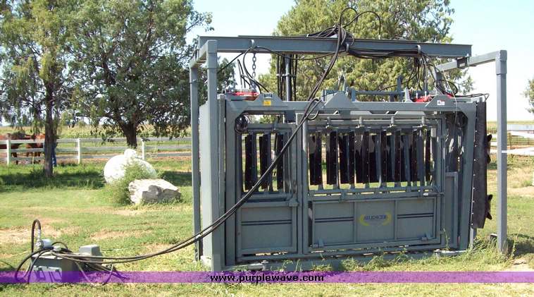 Silencer hydraulic cattle working chute with pump. Has palpitation doors on both sides, side drop doors, neck extender bars and overhead scale. Heavy duty extended model. Brand new in June 2008. Has only had 110 head ran through chute. SHE00318. 9820 CR 32. Sedgwick, Co 80749 Condition = 2 Visually inspected and looks to be in good condition. Buyer responsible for inspecting merchandise before sale.