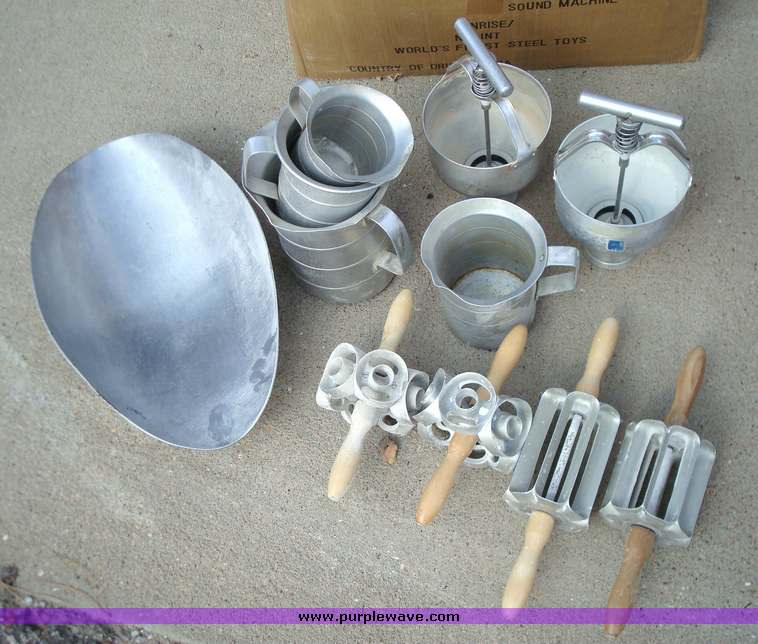 (4) dough style cutters. (4) various size aluminum pitchers. Scale product holder. (2) dough formers. 2306 Vine Street. Hays, Ks 67601 Condition = 3 Sold as pictured, item has not been tested. We have made no attempt to evaluate this merchandise other than picturing it.
