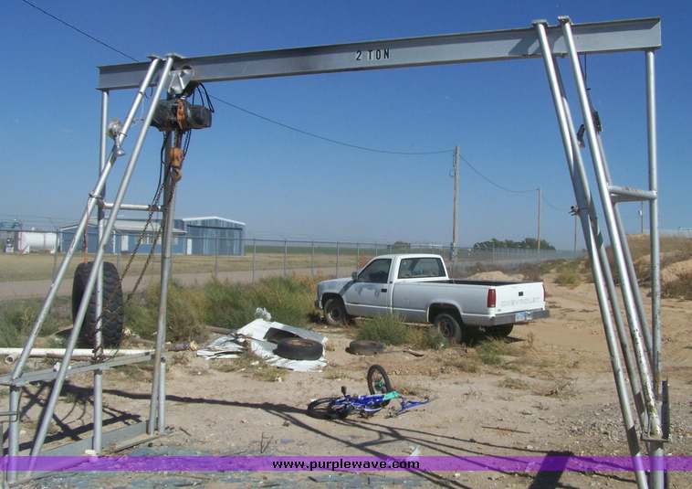 Purple Wave is selling a used Automotive Parts or Acces. in Kansas. This item is a with the following: A frame shop hoist. Two ton capacity with two ton electric hoist. 400 Dennis. Sublette, Ks. 67877Condition = 3Sold as pictured, item has not been tested. We have made no attempt to evaluate this merchandise other than picturing it.