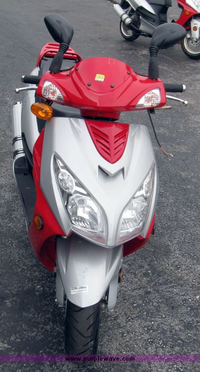 Baja Sun City 150cc Road Scooter. Street Legal. Four Stroke Engine. Automatic Clutch. Front and Rear Driving Lights. Telescopic Front Suspension. Dual Shock Rear Suspension. Hydraulic Front and Rear Brakes. Tires: 130-60-13. 53.13" Wheelbase. Model SC150. Broken turn signal. No battery. With key. Cosmetic damage. Unit is sold "as-is" no exchanges or refunds. LWGTCKP637C000657. Purple Wave Kansas City. Lee's Summit, MO Condition = 3 Sold as described, item has not been tested. We have made no attempt to evaluate this merchandise other than picturing it.