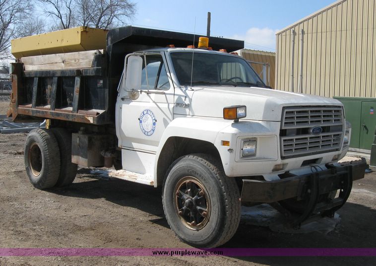 Purple Wave is selling a used Construction Dump Truck in Kansas. This item is a 1990 Ford F-700 dump truck with 8' Flink spreader body with the following: 28,227 miles on odometer, Eight cylinder gasoline engine, Five speed manual transmission, 10' dump bed, Snow blade mount, Electric brakes, (50) gallon fuel tank, Brakes and exhaust need work