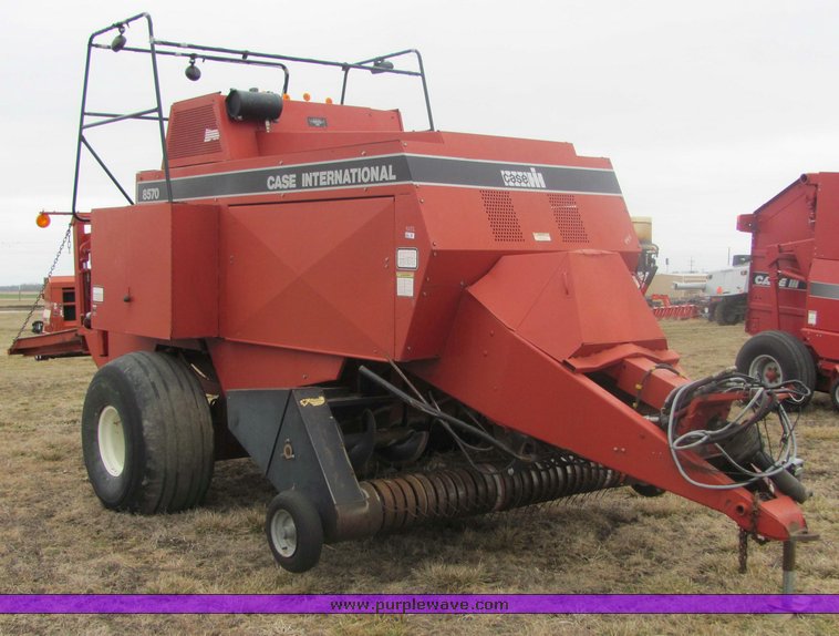 Purple Wave is selling a used Square Baler in Kansas. This item is a Case 8570 3x3 large square baler with the following: Twine wrap, 1000 PTO, 21.5L-16.1 tires, Work lights, Bale monitor, Electronic display, Adjustable plunger load, Bale count and average weight display, Serial CFH0068410