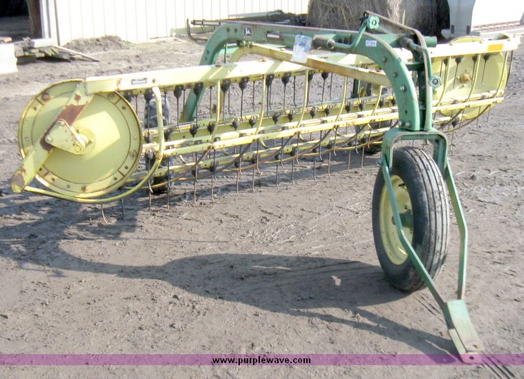 Purple Wave is selling a used Hay Rake in Kansas. This item is a John Deere 670 side delivery rake with the following: Metal tires with rubber mounts, Wheel drive, Serial E00670X658095