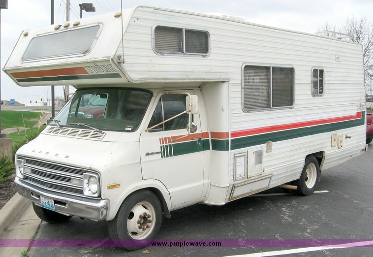 Purple Wave is selling a used RV in Missouri. This item is a 1977 Dodge F40 motor home with the following: 50,784 miles on odometer, 360 cu. in. V8, Automatic transmission, Tioga package, One ton chassis, Approximately 24'L, Self contained rear bath with shower, Four burner stove, Double sink, Refrigerator, Microwave, Closet, Roof/window 110 volt AC, 8.00R16.5 LT tires, Power brake booster replaced in 2009
