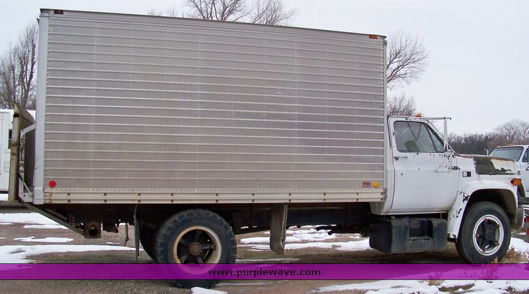 Purple Wave is selling a used Box Truck in Kansas. This item is a 1987 Chevrolet C60 box truck with the following: 137,783 miles on odometer, 5.7L V8 gas engine, Manual transmission, 14' enclosed box, Anthony lift gate, Heat, Manual windows and locks, Front wheels have been replaced with tubless rims and tires, Clutch noisy