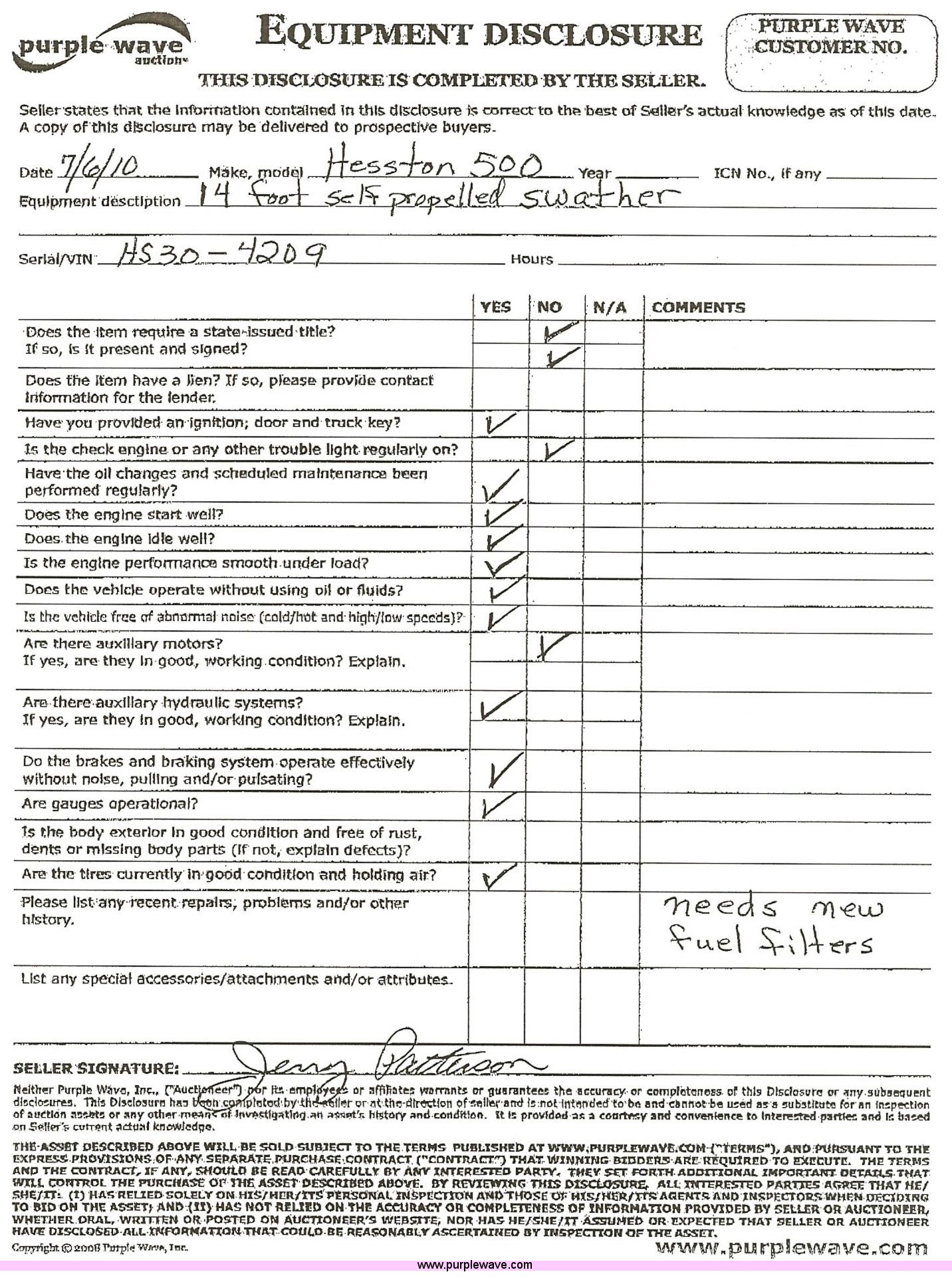 Hesston 500 14' self-propelled swather has sold in Glencoe, Oklahoma for $330. Item 1000 sold on July 28th, 2010.