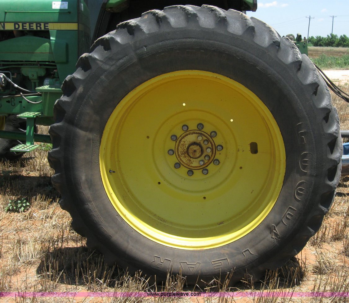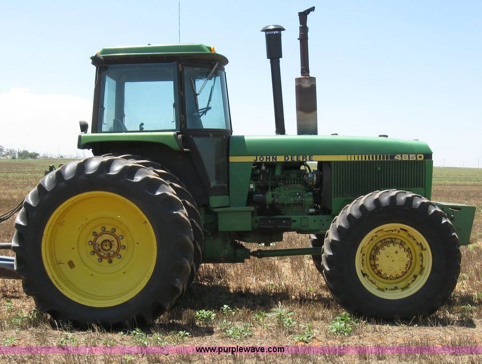 Purple Wave is selling a used Tractor in New Mexico. This item is a 1984 John Deere 4850 MFWD tractor with the following: 11,370 hours on meter, John Deere six cylinder 466cid 180hp diesel, 15 speed power shift transmission, Heat and air conditioning, AM/FM radio, 1000 PTO, Three hydraulic remotes, Three point with quick hitch, Front tractor weights, 16.9R30 front tires, 18.4R42 rear dual tires, Inside wheel weights, Serial RW4850P006412, Stock# 13257