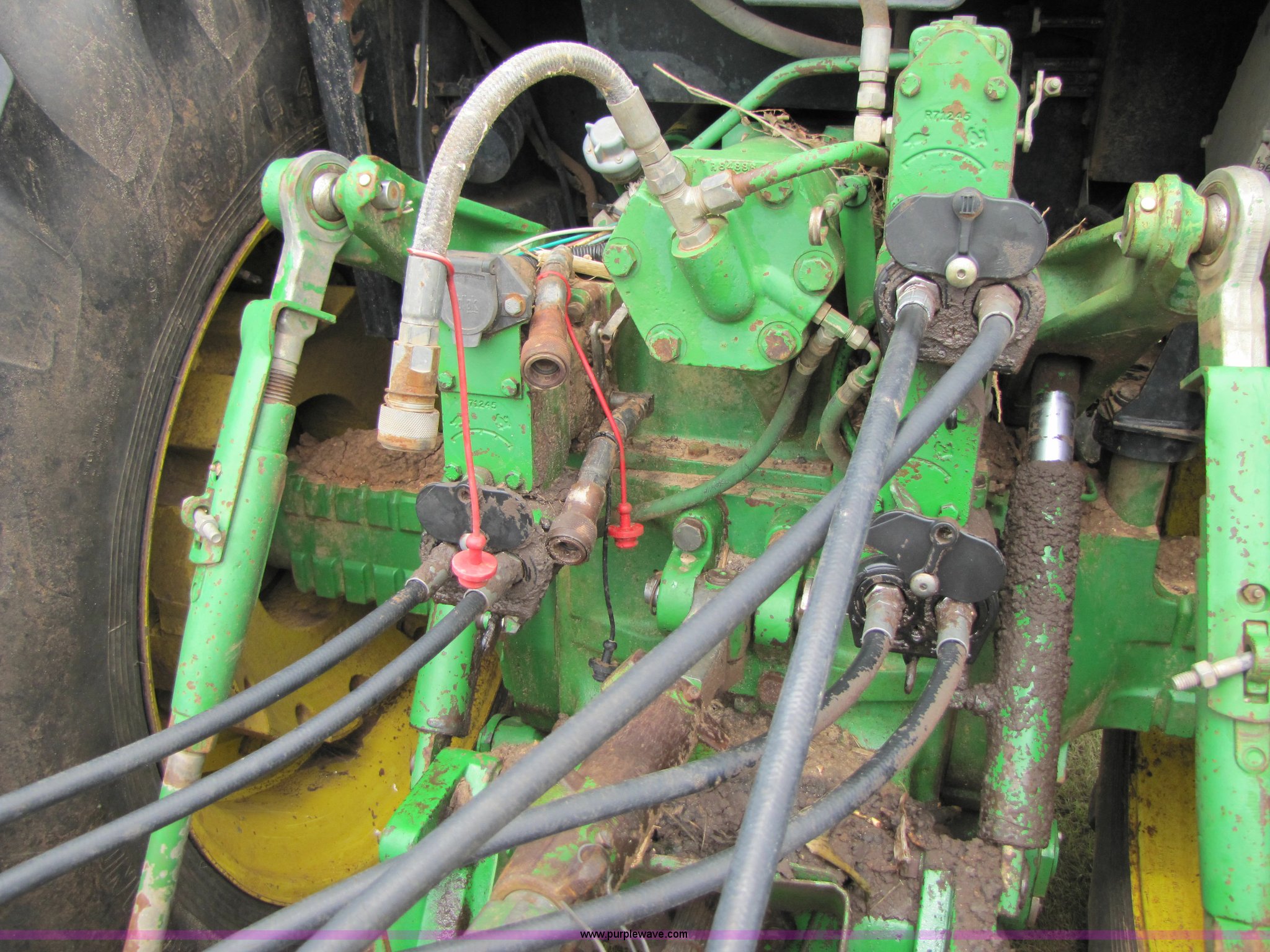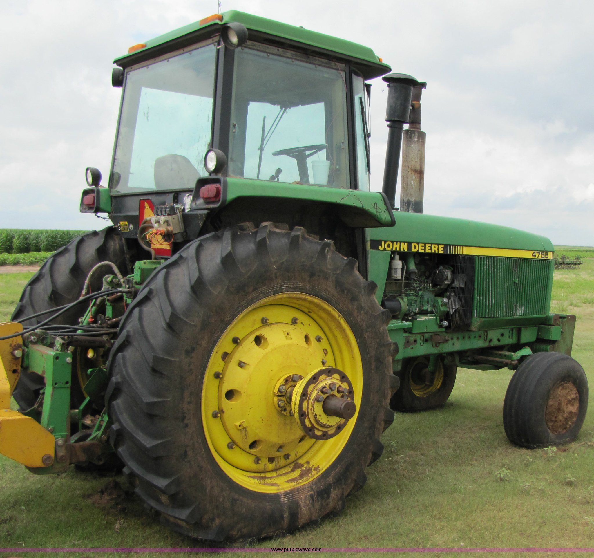 Purple Wave is selling a used Tractor in Texas. This item is a 1989 John Deere 4755 tractor with the following: 2714 hours on meter, Approximately 12,714 actual hours, John Deere six cylinder 7.6L turbocharged diesel engine, Serial RG6076A108194, John Deere Powershift transmission, 15 forward and four reverse gears, Differential lock, AC and heat, AM/FM radio, (18) front weights, Four sets hydraulic remotes, 1000 PTO, Three point with quick hitch, Seven pin electrical outlet, 11.00-16 front tires, 18.4R42 rear tires, Dual hubs, Dual tires not included, Serial RW4755P001625, Stock# 14505