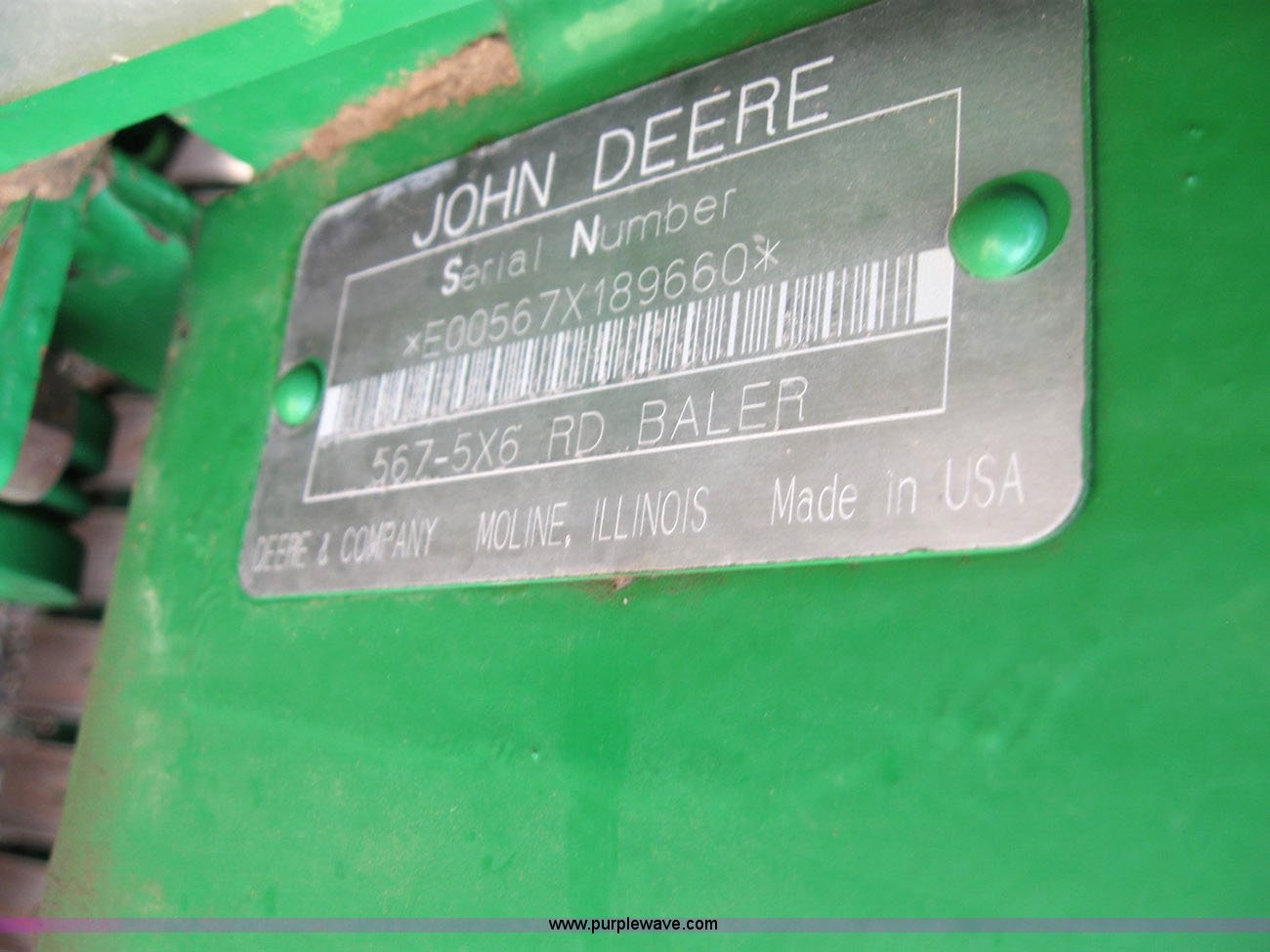 Purple Wave is selling a used Round Baler in New Mexico. This item is a 2002 John Deere 567 5x6 round baler with the following: Mega wide pickup, Twine and net wrap, 31x15.5-15 tires, 540 PTO, Eight belts, 2,000 lbs max bale weight, 7,594 bales on counter, Serial E00567X189660, Stock# 13962