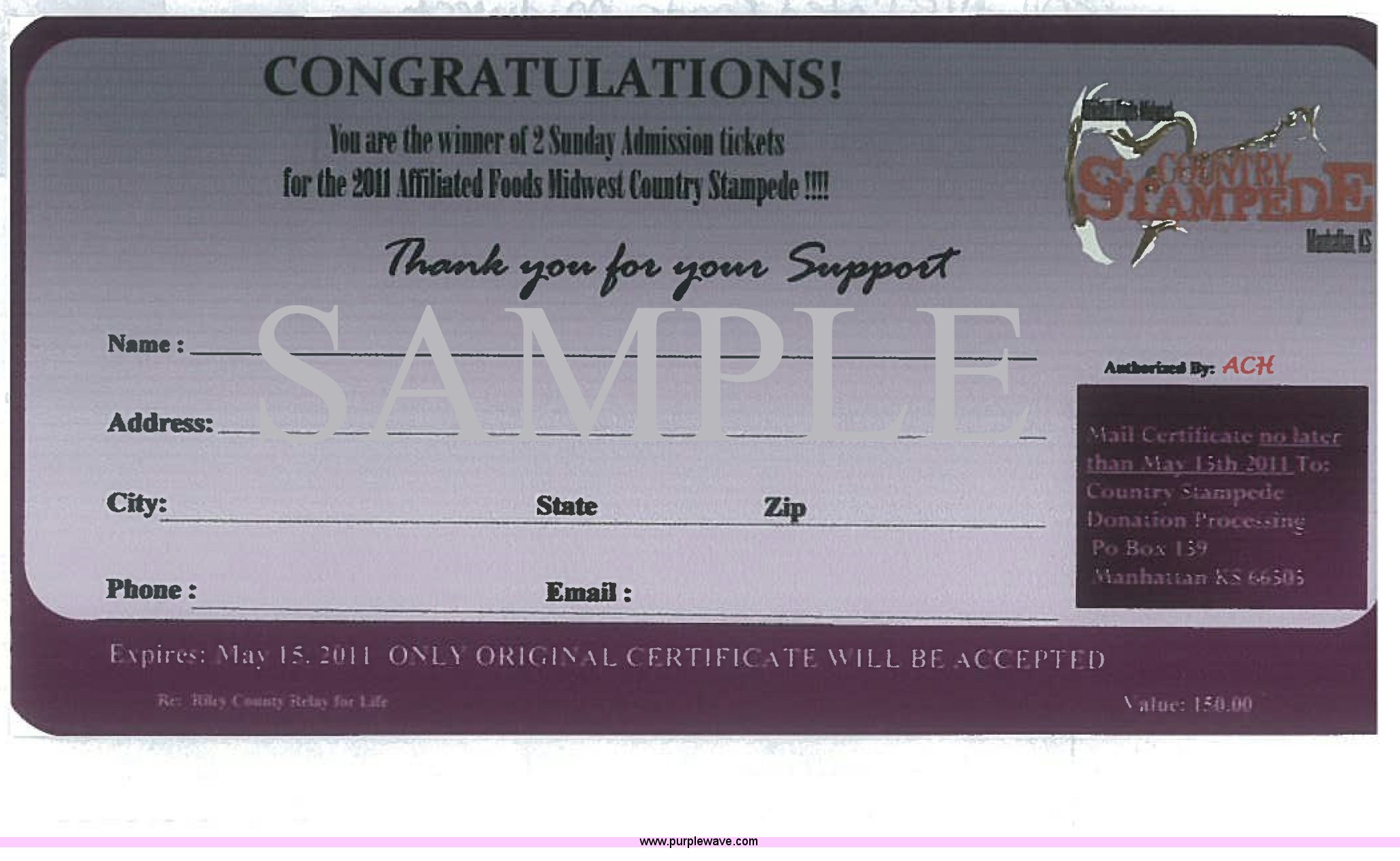 Purple Wave is selling a used Other Industrial or Business in Kansas. This item is a "Boot Scootin' Boogie" with the following: (2) Sunday admission tickets to the 2011 Country Stampede
