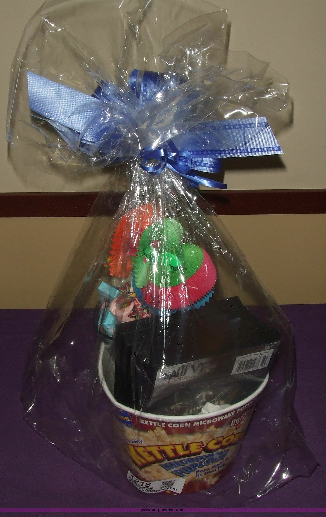 Purple Wave is selling a used Other Industrial or Business in Kansas. This item is a "Movie Night" with the following: (2) $7 Carmike Cinemas movie gift certificates, Tub of kettle corn, Ice Age DVD, G-Force DVD, Surrogates DVD, Terminator DVD, Saw VI DVD, Glass cup "Somebody in Kansas Loves Me" filled with assorted candy, Harmonica