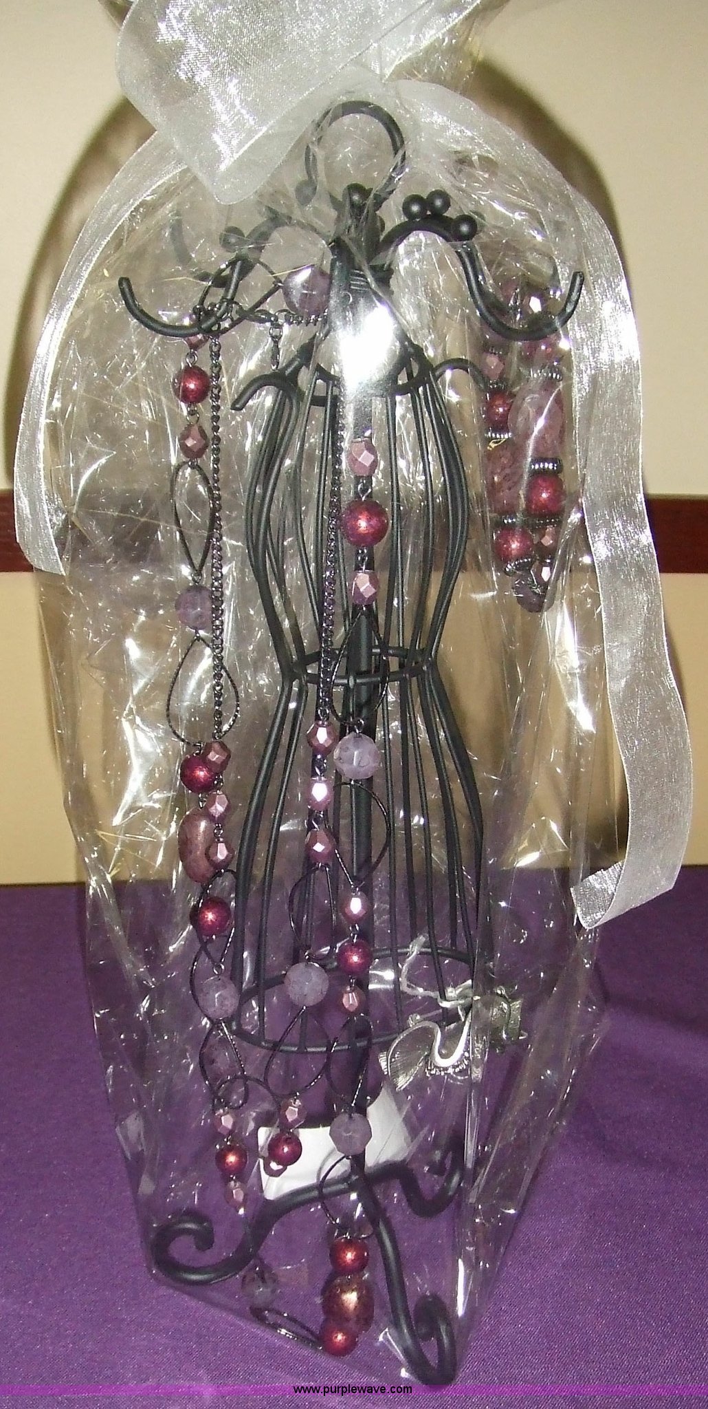 "Rhapsody". Donated by Heidi Mosher and Premier Jewelry. Rhapsody-hermatite plated beads and faux nuggets 48" necklace with lobster claw closure, 7" stretch bracelet, Camille antique matte silver plated crystals Side pendant pin, Jewelry stand. 825 Levee Dr.. Manhattan, KS 66502