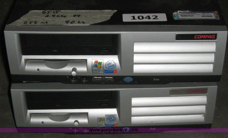 Purple Wave is selling a used Computers in Kansas. This item is a (2) Compaq computers with the following: Pentium 4 2.4GHz processor, 256MB RAM, 40GB hard drive, Keyboards and mice, Power cords, No operating system installed