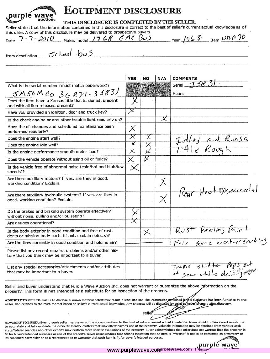Purple Wave is selling a used Bus in Kansas. This item is a 1969 GMC CS2903 bus with the following: 84,427 miles on odometer, V8 350cid gas engine, Three speed manual transmission with low, Heat, 9.00-20 tires