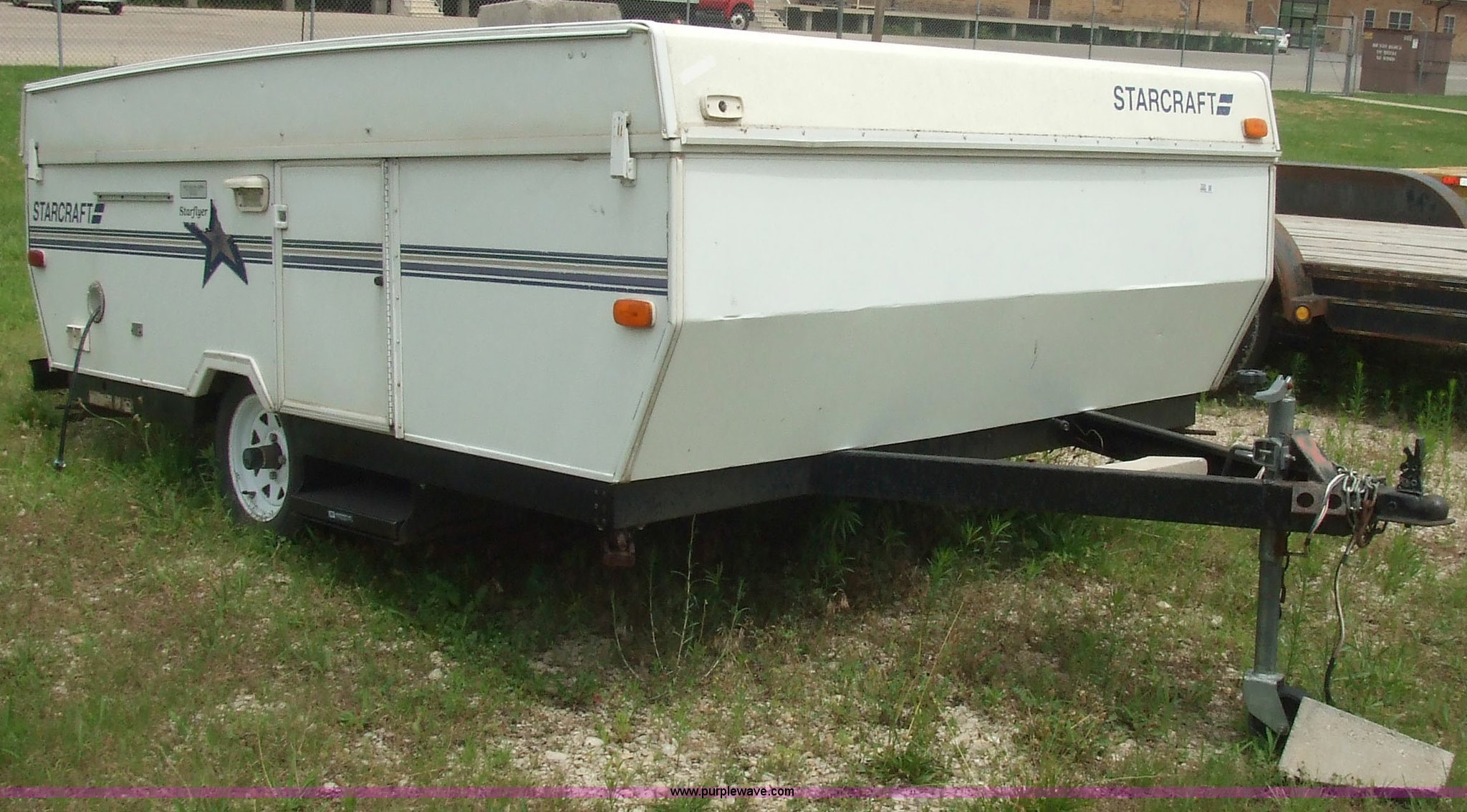 Purple Wave is selling a used RV in Kansas. This item is a Starcraft Starflyer pop up pull behind camper with the following: 10'4"L x 7'1"S, GVWR 2,200 lbs, Fresh water inlet, Waste water outlet, Lights, Jack, Propane bottle, Electrical outlets, 5.30-12 tires, No AC unit