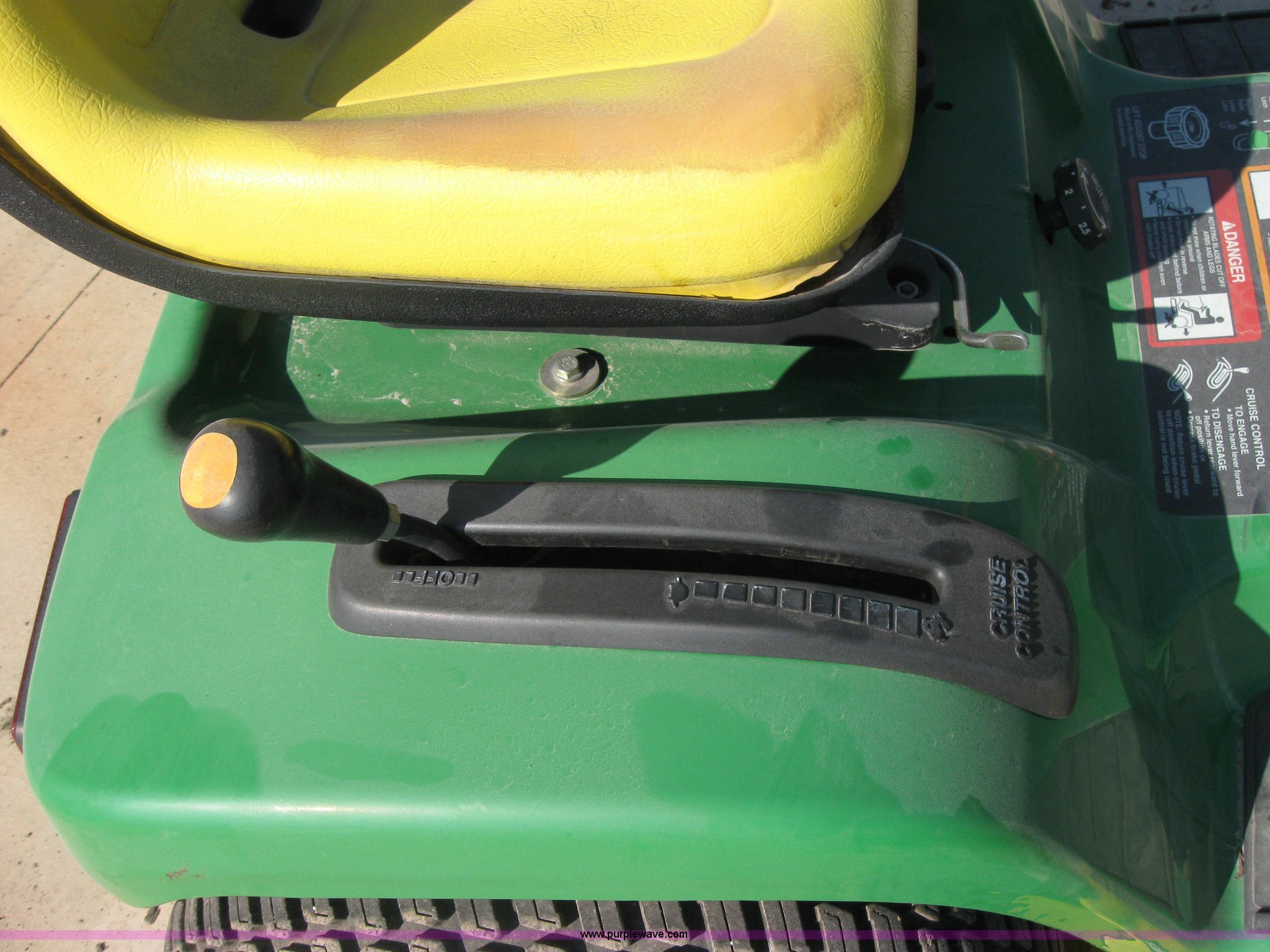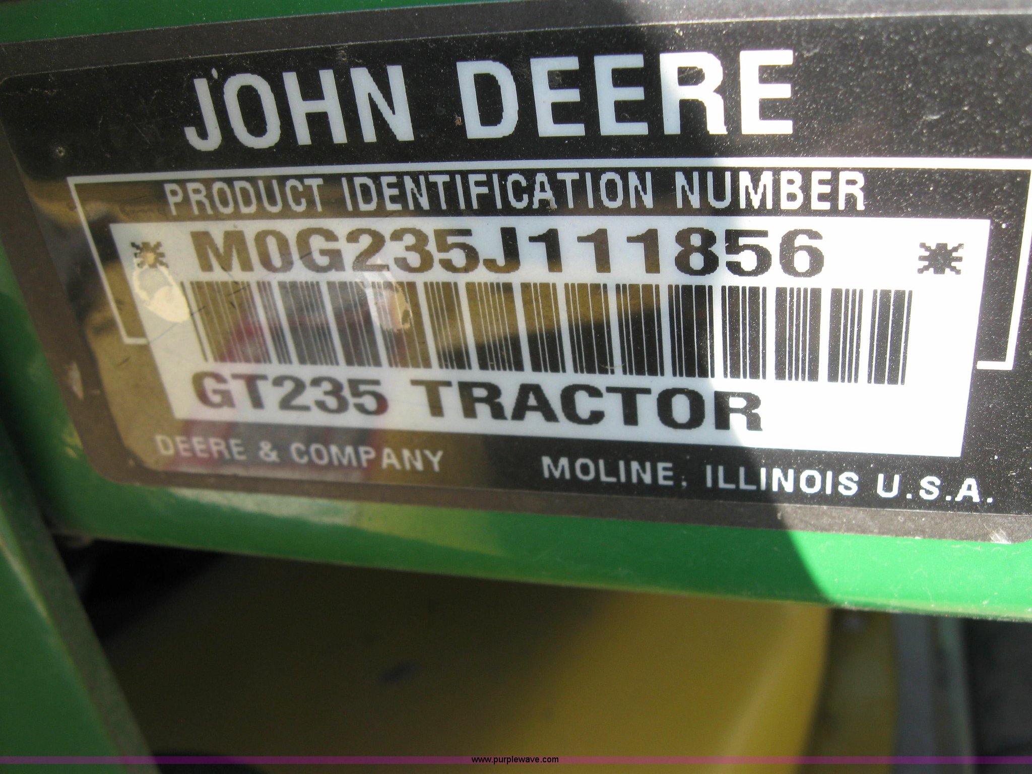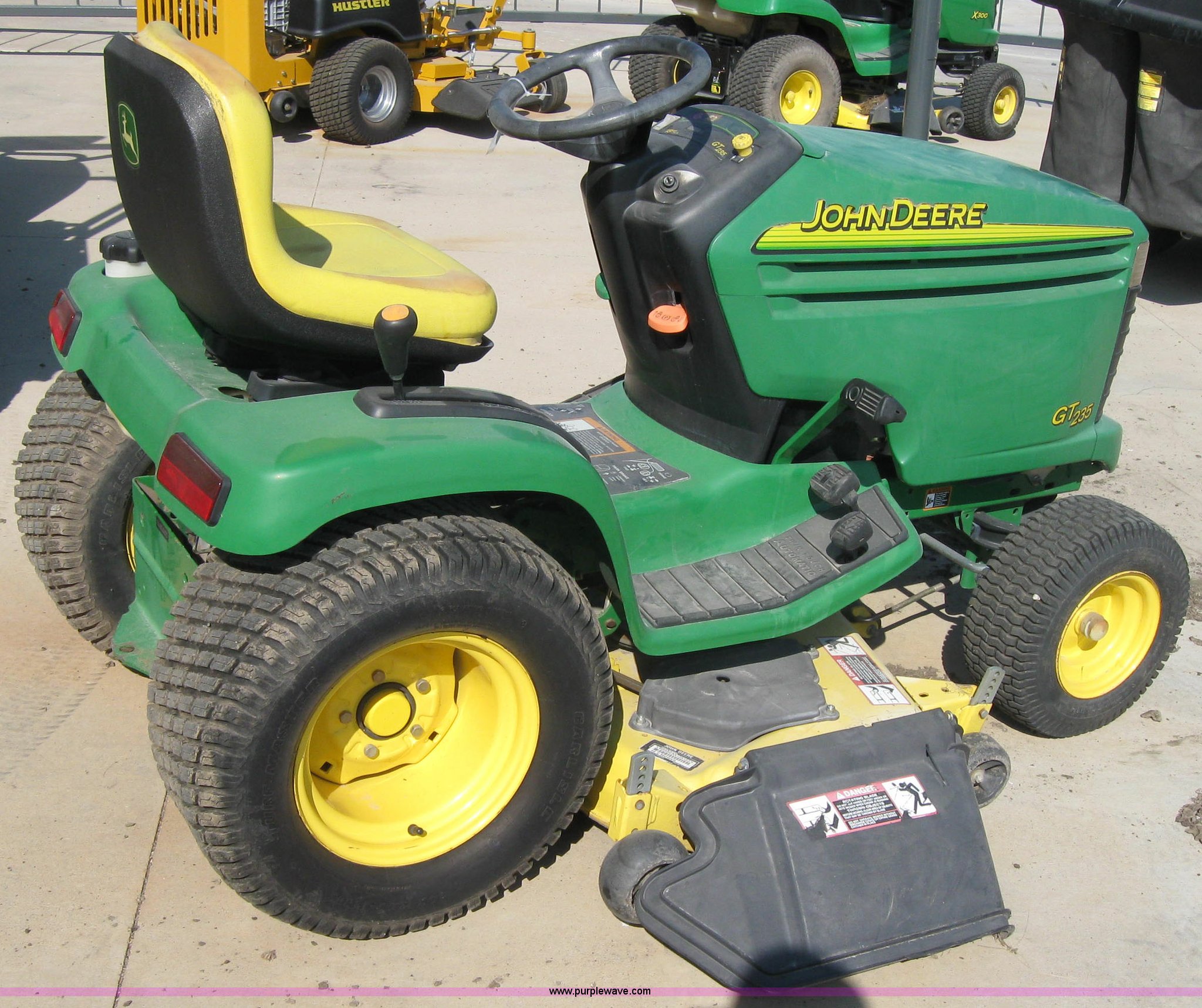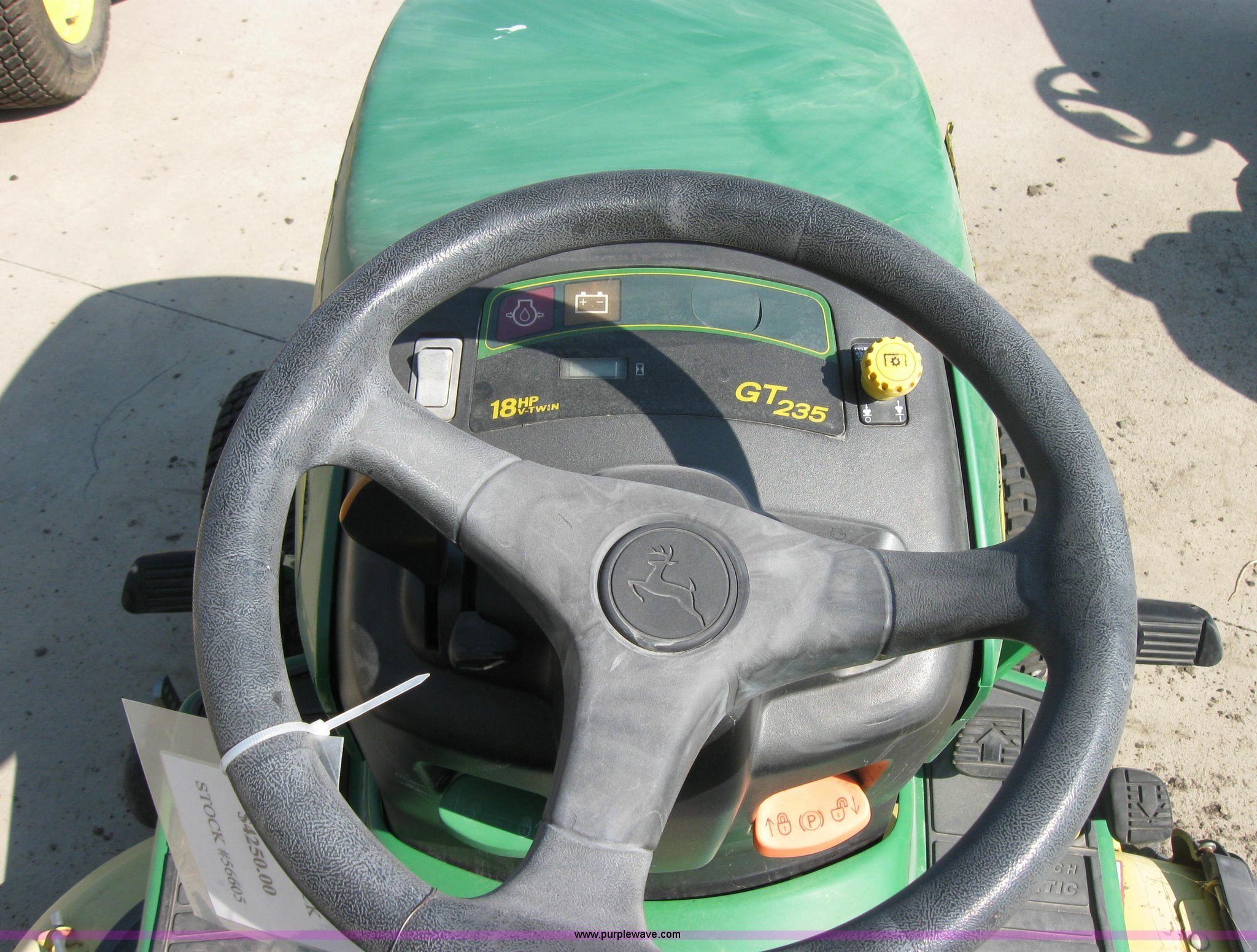 Purple Wave is selling a used Lawn Mower in Kansas. This item is a 2004 John Deere GT235 lawn mower with the following: 200 hours on meter, 48" cutting width, 18 Hp Kawasaki V-twin engine, Hydrostatic drive transmission;, Serial M0G235J111856