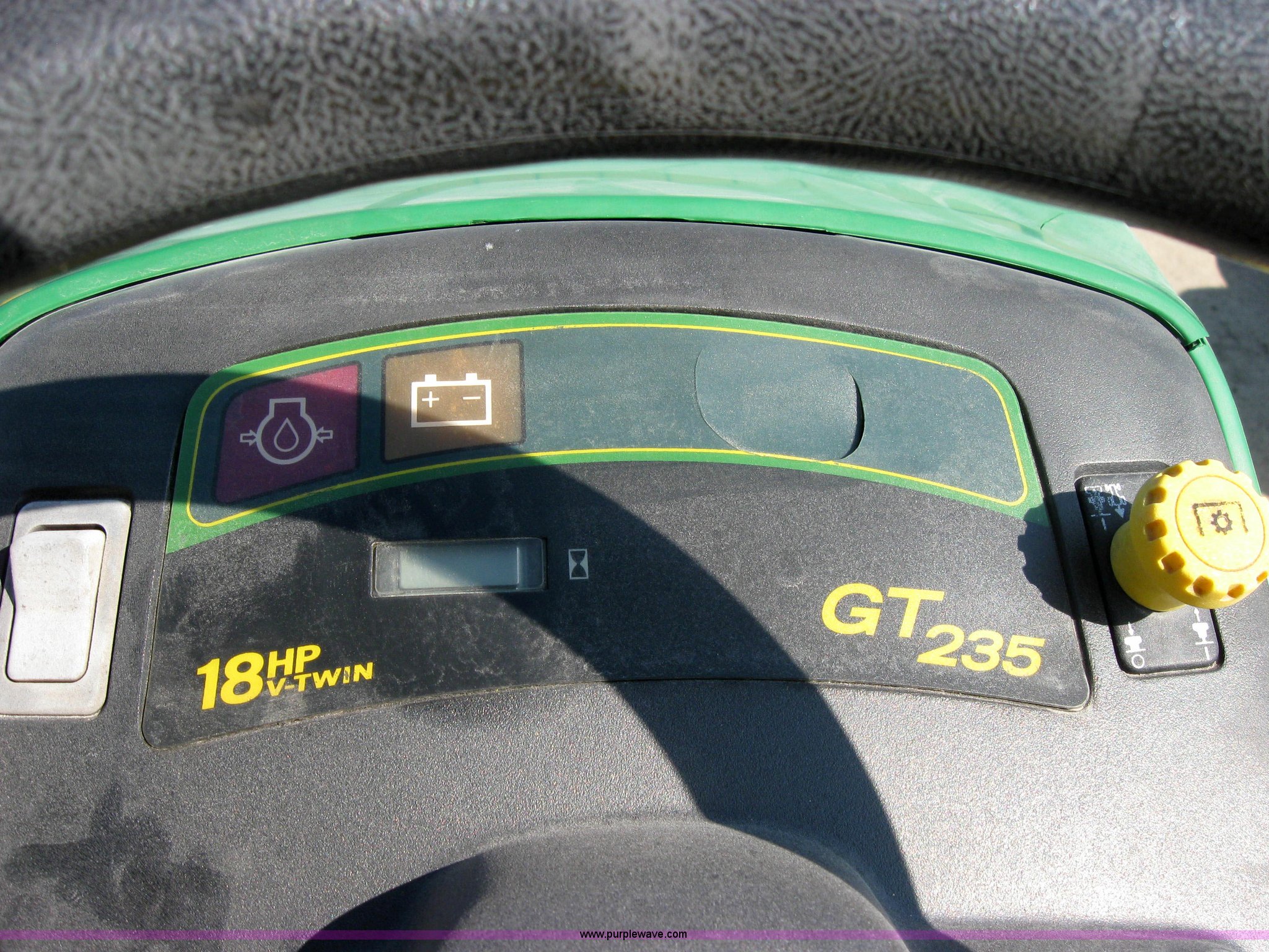 2004 John Deere GT235 lawn mower. 200 hours on meter, 48" cutting width , 18 Hp Kawasaki V-twin engine, Hydrostatic drive transmission;, Serial M0G235J111856. Shipping quotes available. Prairieland Partners. 1744 County Rd F. Emporia, KS 66801