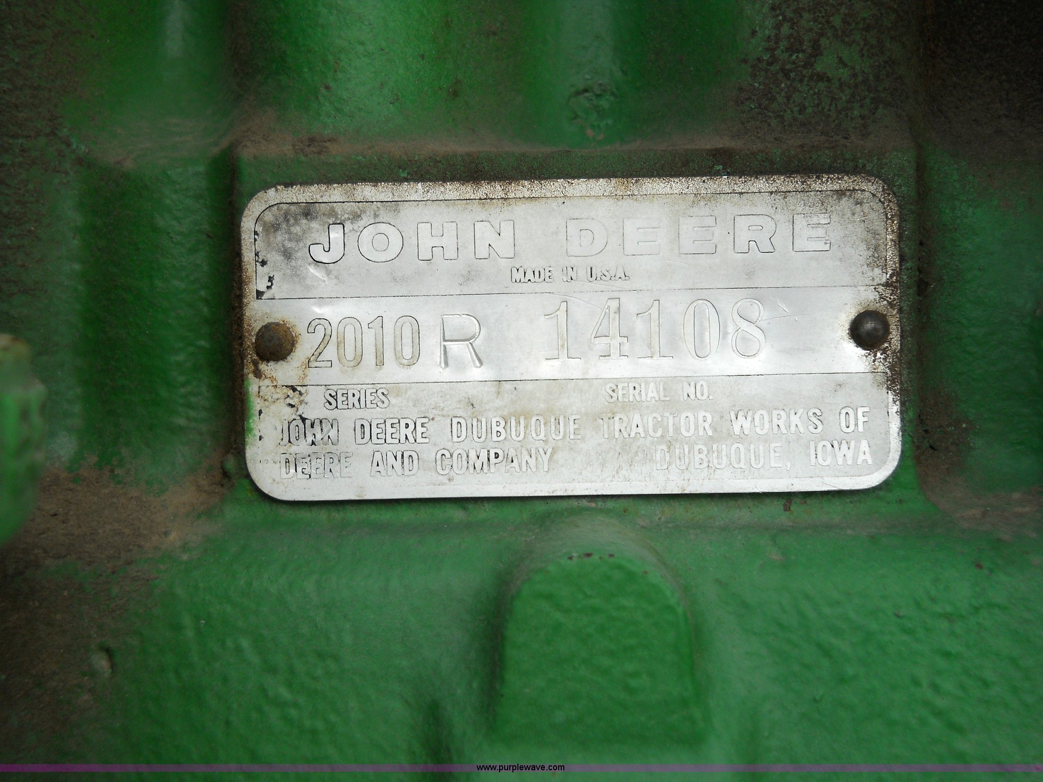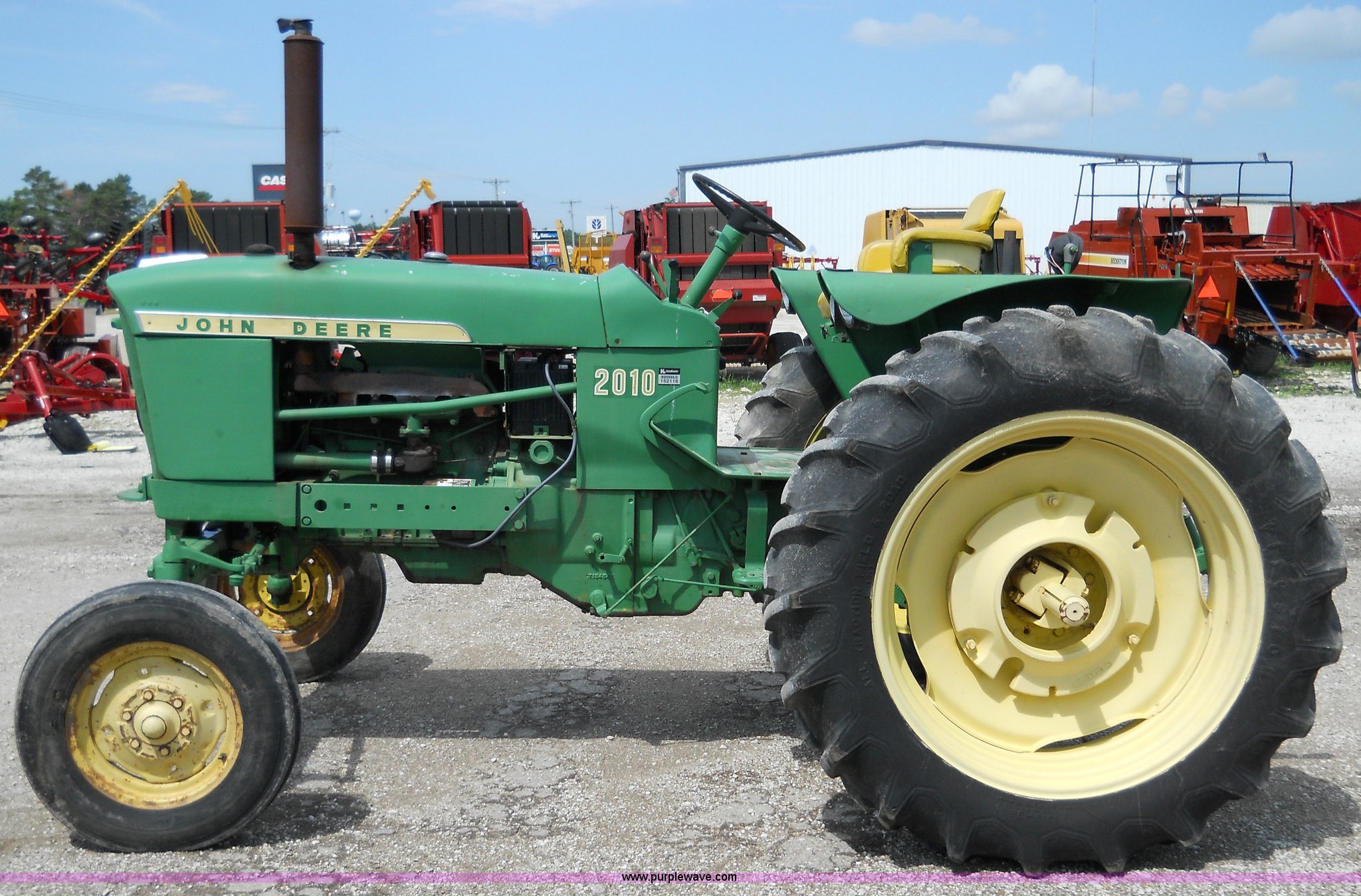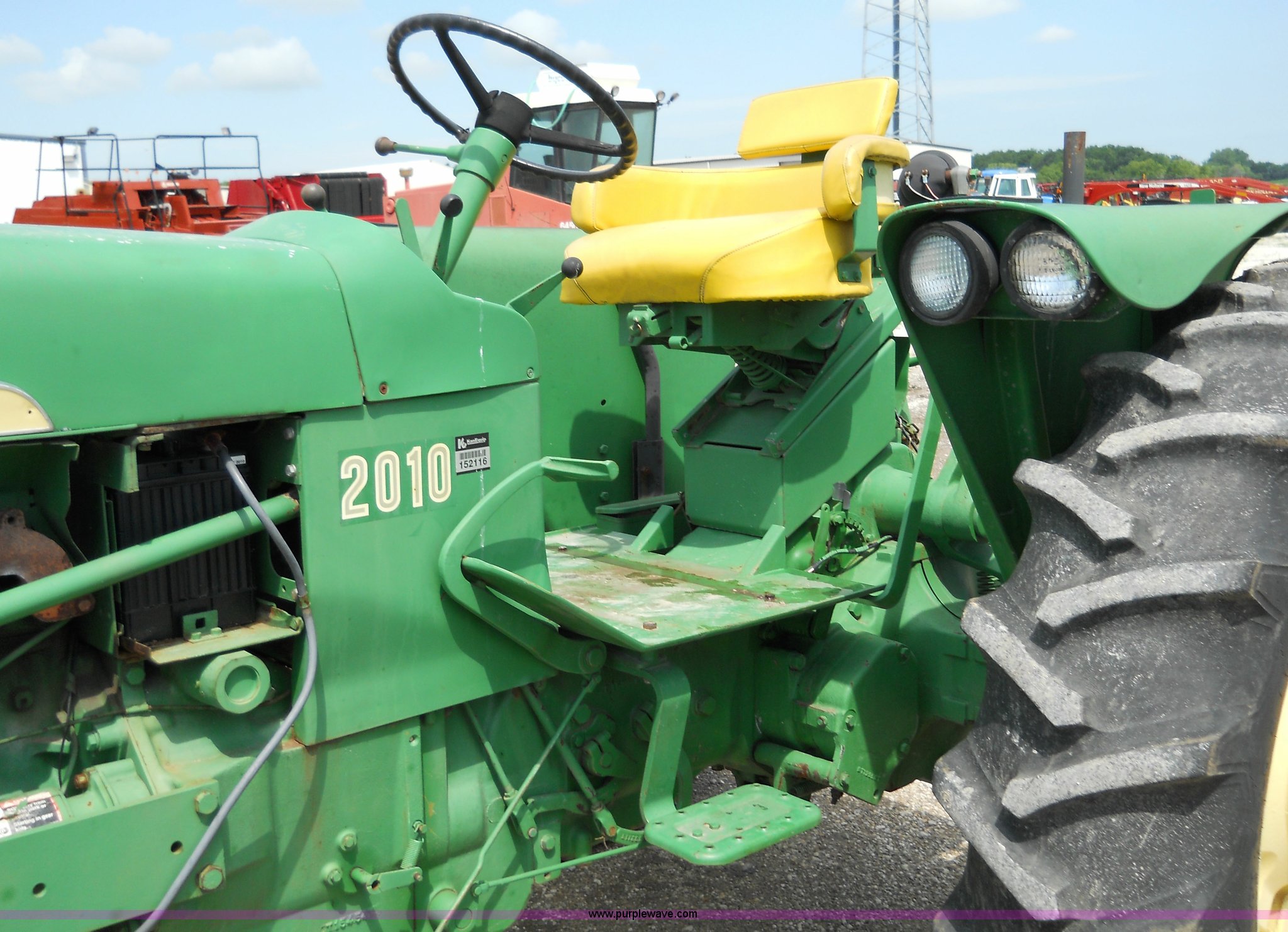 Purple Wave is selling a used Tractor in Kansas. This item is a John Deere 2010 tractor with the following: 3308 hours on meter, Record indicates year of manufacture to be 1961, Four cylinder 46hp gas engine, Eight speed transmission with two reverse gears, One set hydraulic remotes, 540 PTO, Three point, 13.9-36 rear tires, 6.00-16SL front tires, Serial 14108