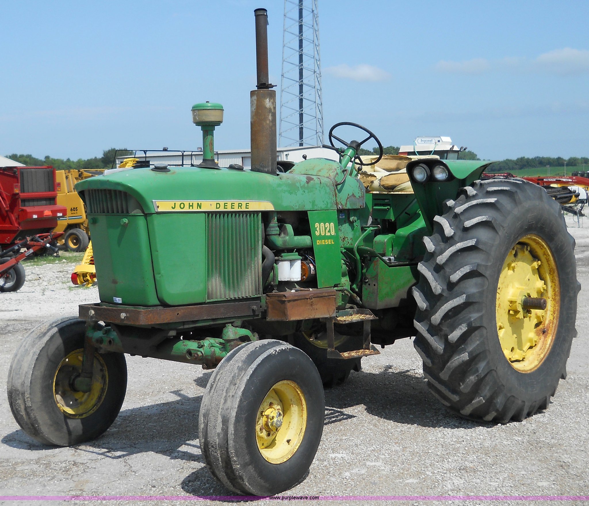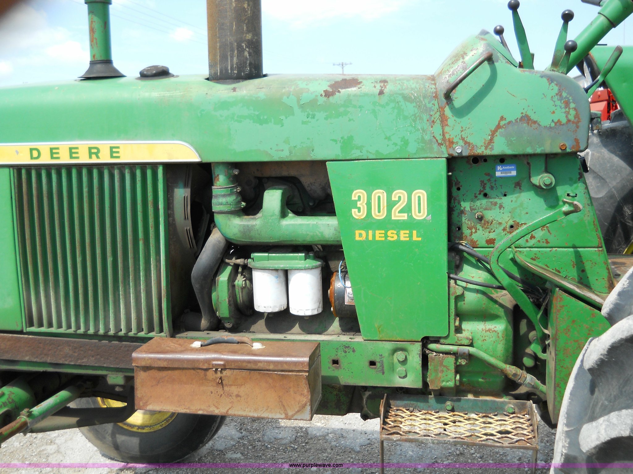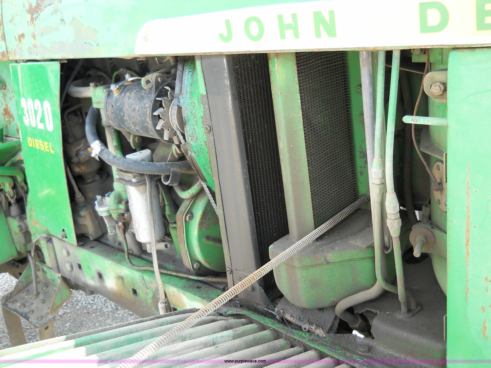Purple Wave is selling a used Tractor in Kansas. This item is a John Deere 3020 tractor with the following: 7699 hours on meter, Record indicates year of manufacture to be 1967, Four cylinder 71hp diesel engine, Eight speed transmission with two reverse gears, (2) hydraulic remotes, 540 PTO, Three point, 18.4-34 rear tires, 11L-15 front tires, Does not included three point top link, Serial 103301R