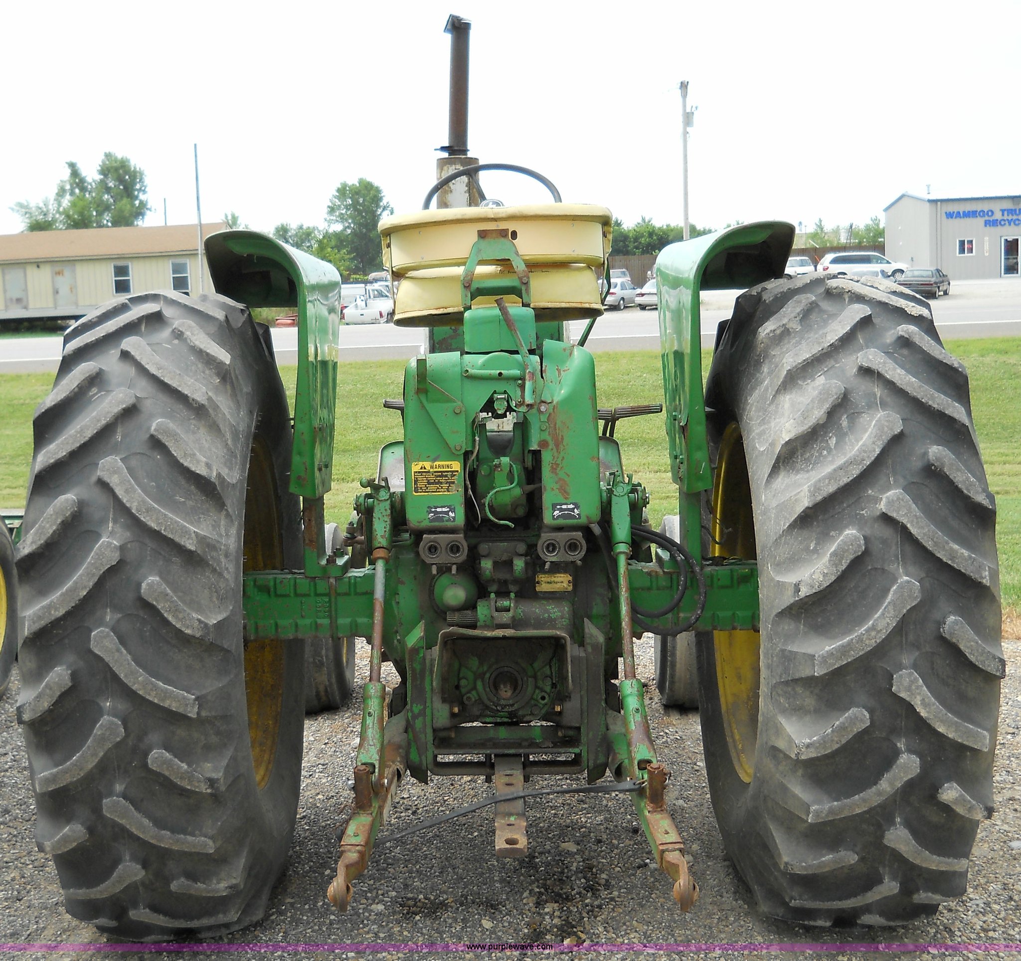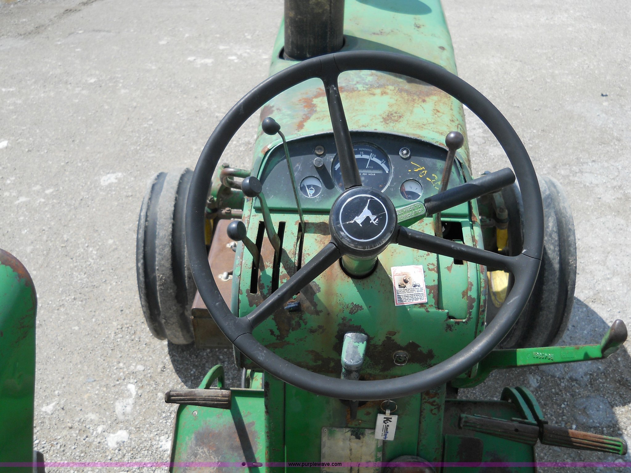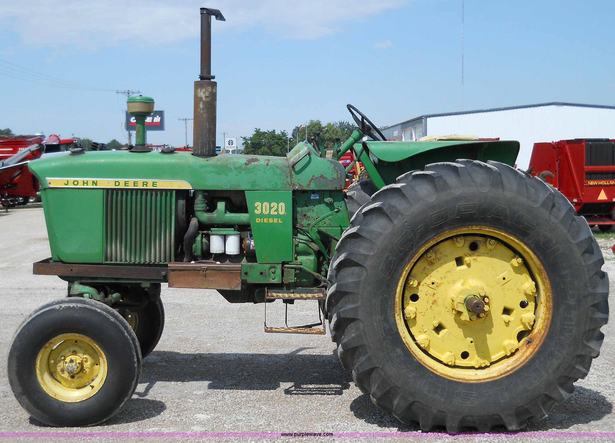 Purple Wave is selling a used Tractor in Kansas. This item is a John Deere 3020 tractor with the following: 7699 hours on meter, Record indicates year of manufacture to be 1967, Four cylinder 71hp diesel engine, Eight speed transmission with two reverse gears, (2) hydraulic remotes, 540 PTO, Three point, 18.4-34 rear tires, 11L-15 front tires, Does not included three point top link, Serial 103301R
