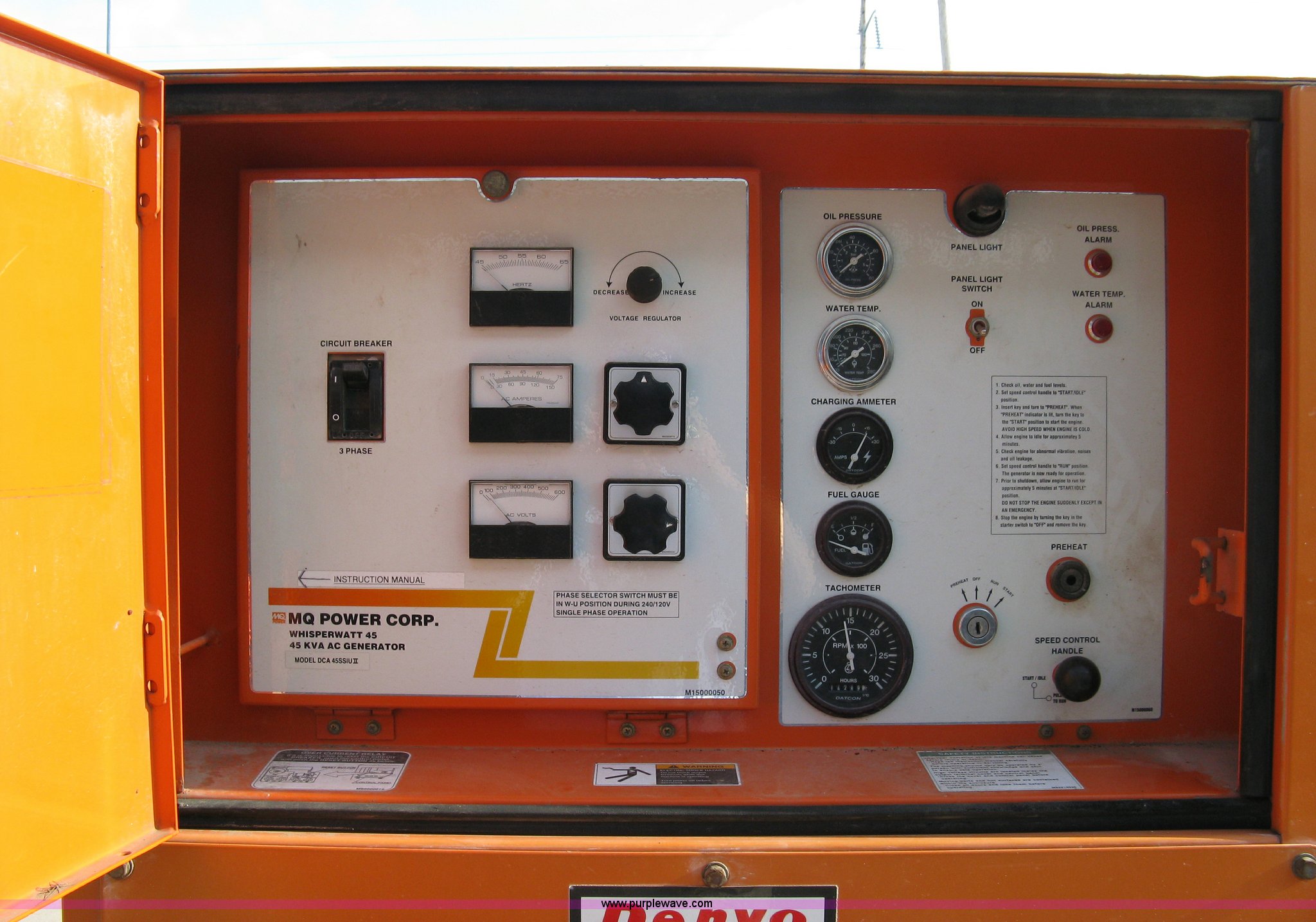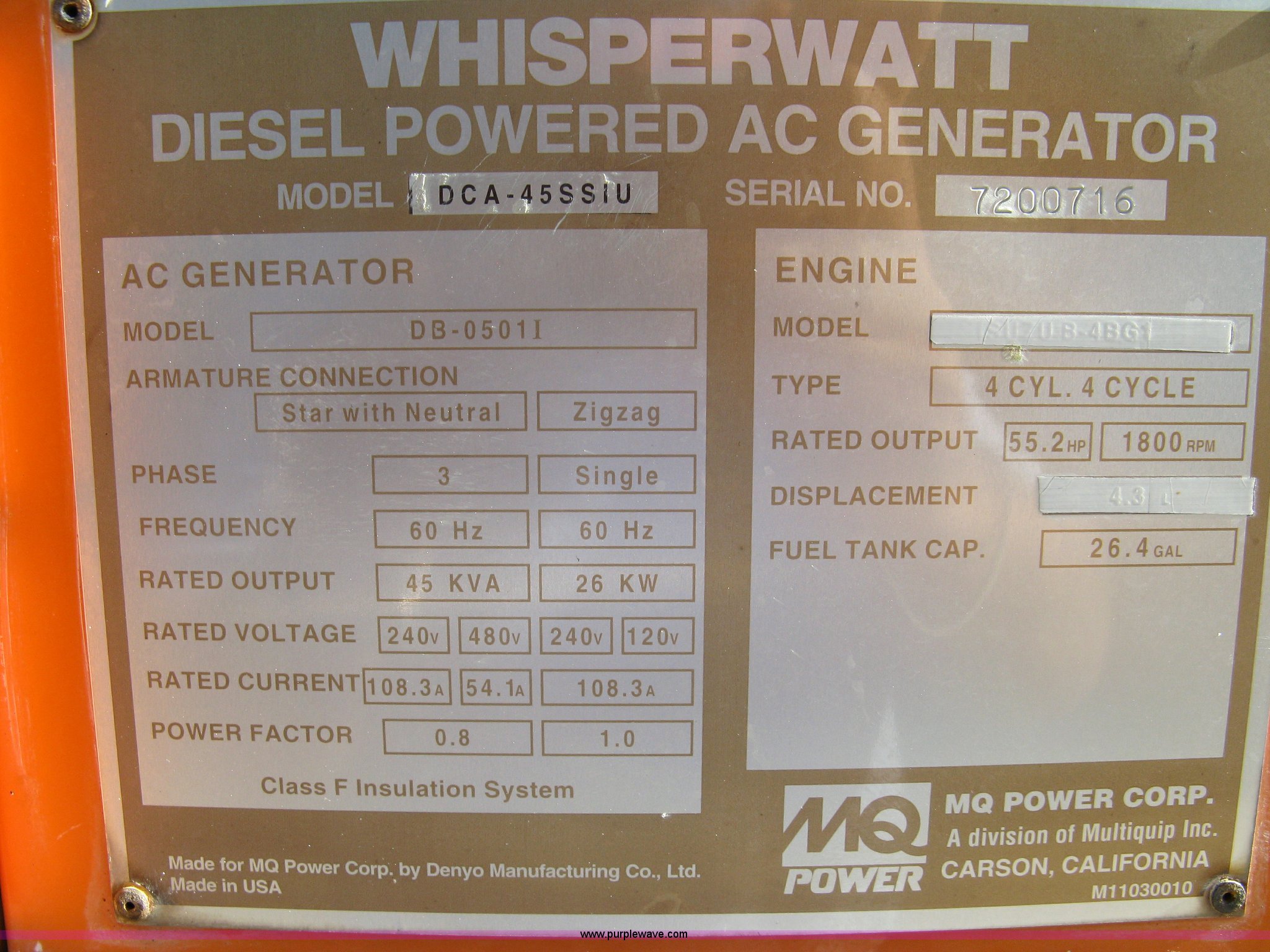Purple Wave is selling a used Generator Set in Kansas. This item is a Multi Quip Whisperwatt MQ Power 45 mobile generator with the following: 14289 hours on meter, Model DCA-45S51U, Denyco Co, Ltd. AC generator, Model DB-05011, Single and three phase, 45kva rated output, 240/480 - 240/120 volts, Isuzu B-4GB1 four cylinder diesel engine, 55hp @ 1800rpm, 26.4 gallon fuel tank, 53 gallon auxiliary fuel tank