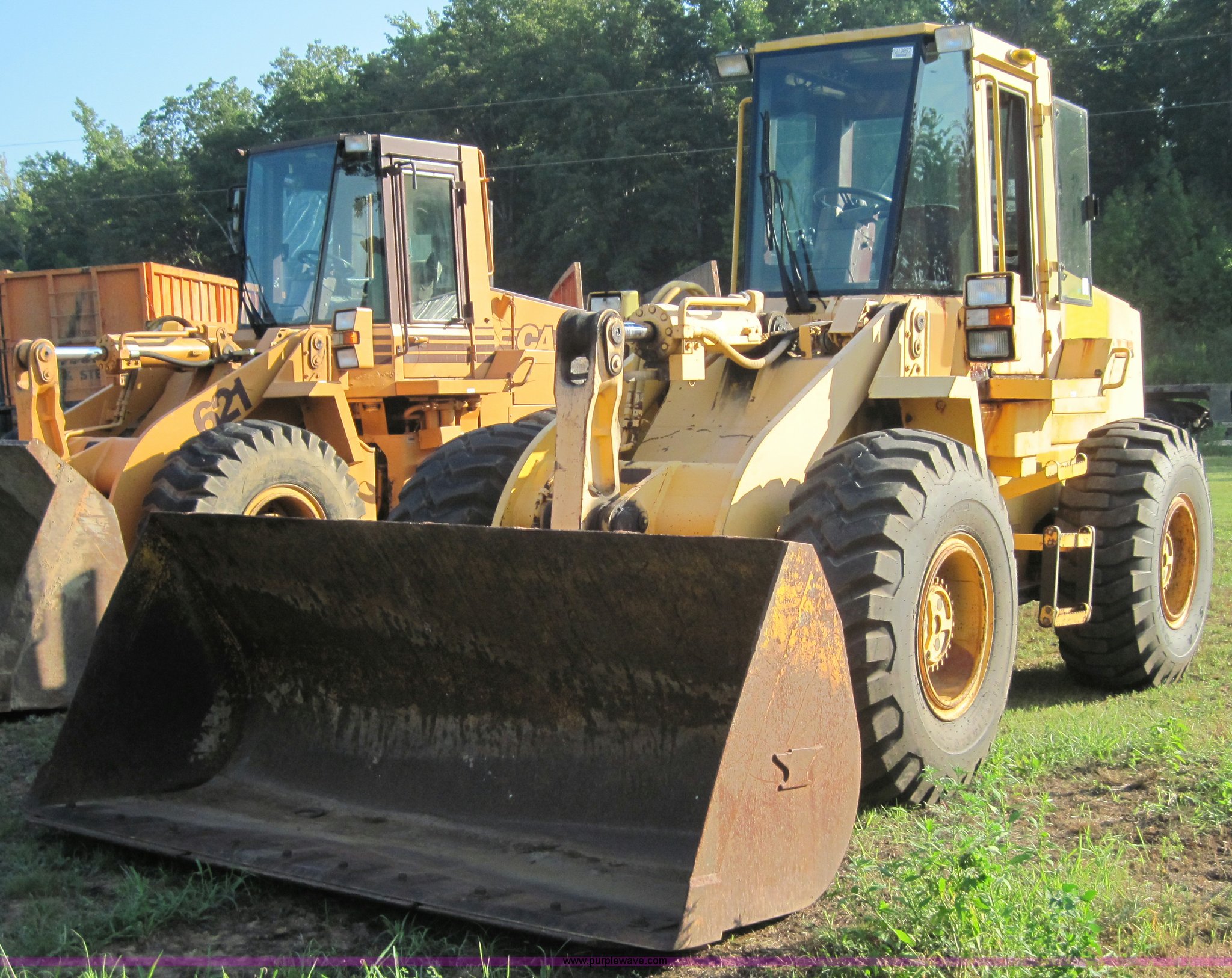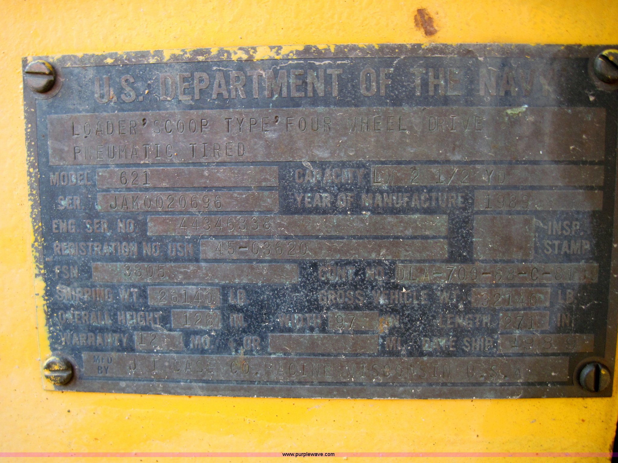 Purple Wave is selling a used Wheel Loader in Missouri. This item is a 1989 Case 621 wheel loader with the following: 5718 hours on meter, Case 6T590 six cylinder 116hp turbocharged diesel engine, 10 hours on rebuilt engine, Four speed shuttle shift transmission, 3.5 cubic yard GP bucket with bolt on edge, Two stick bucket controls, 20.5-25 tires, 26,140 lbs. base operating weight, Serial JAK0020696