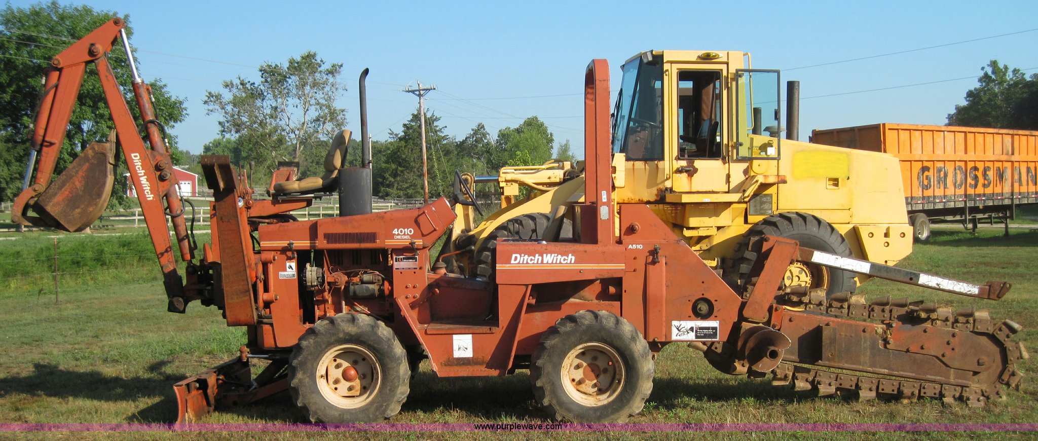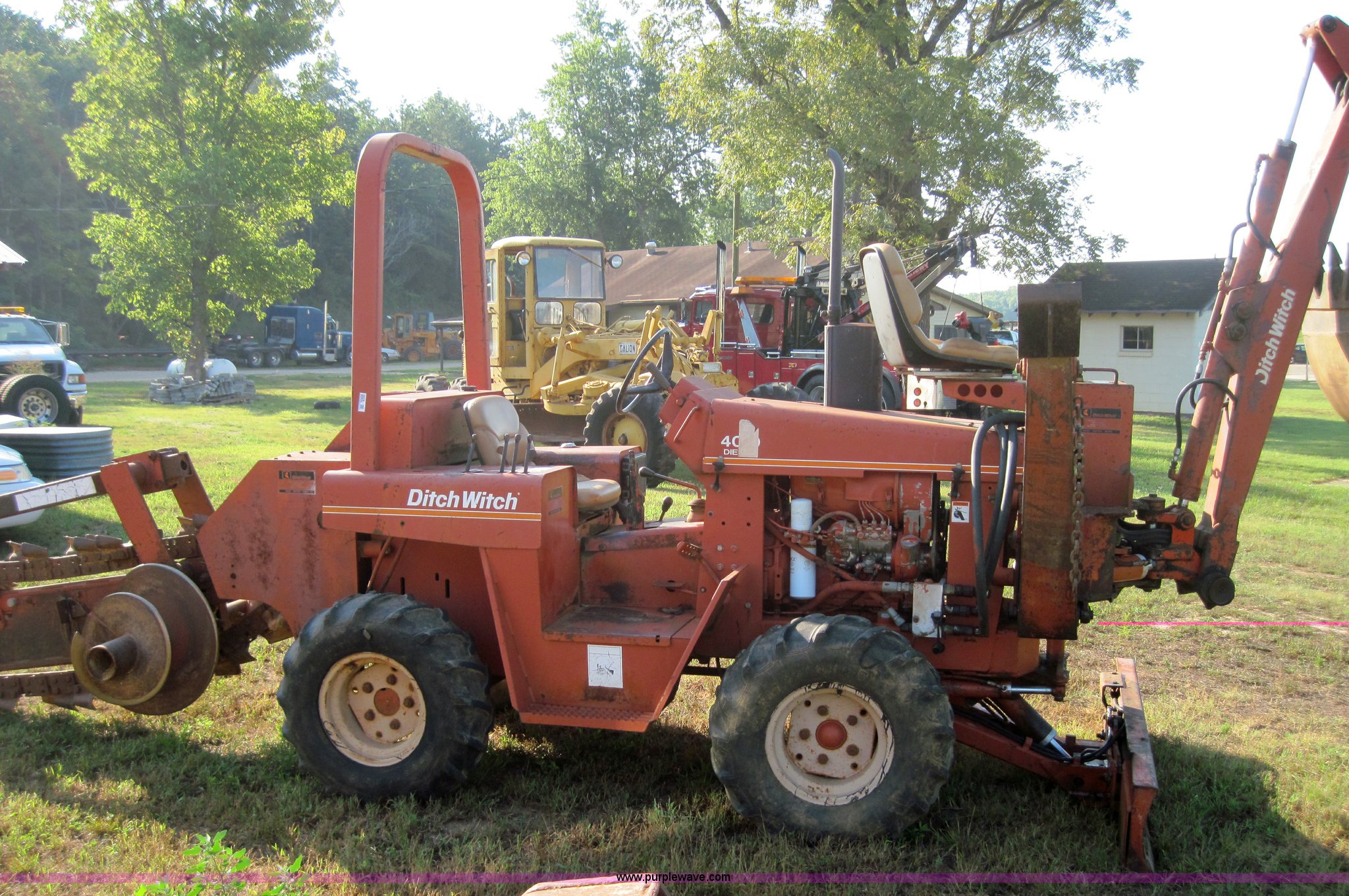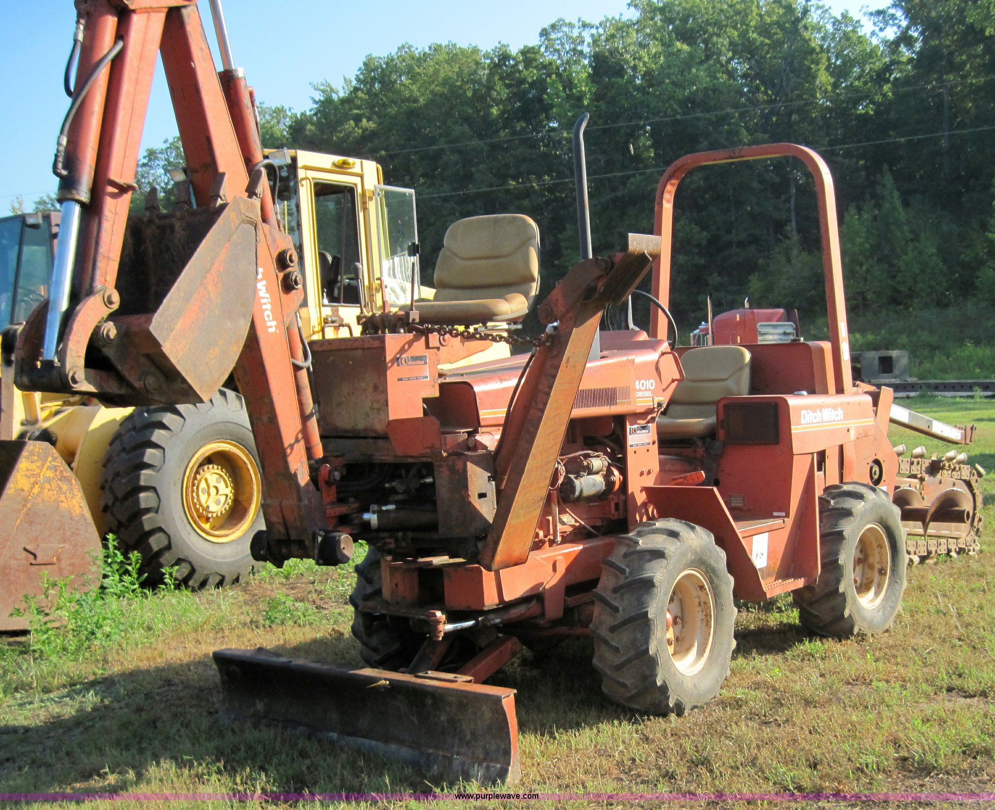 Purple Wave is selling a used Trencher or Rock Saw in Missouri. This item is a Ditch Witch 4010 trencher with backhoe with the following: 741 hours on meter, Three cylinder diesel engine, Four speed transmission, 6' digging depth, Six way blade, 12.5L-15 tires, Serial BD0114