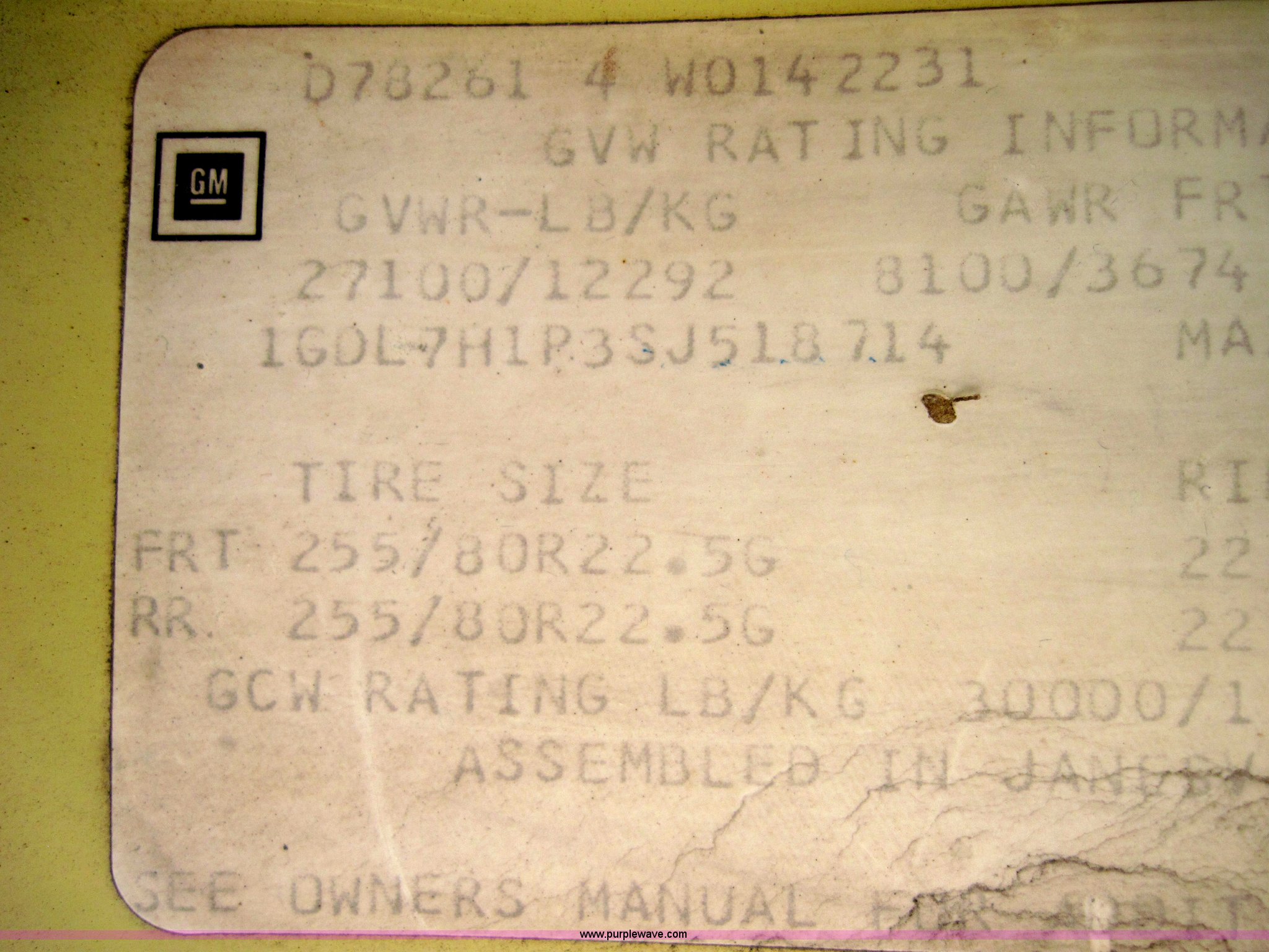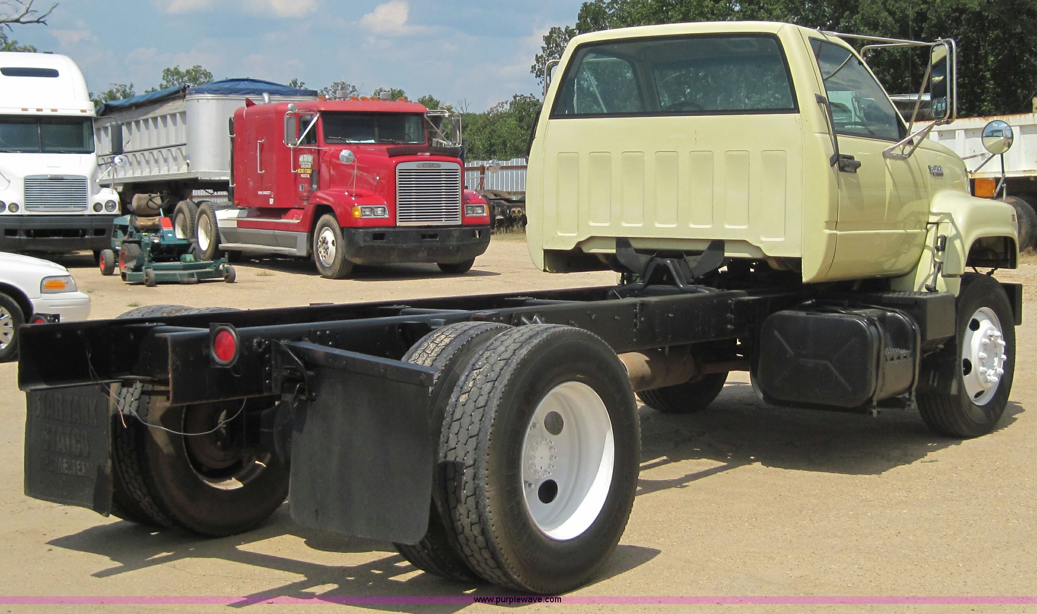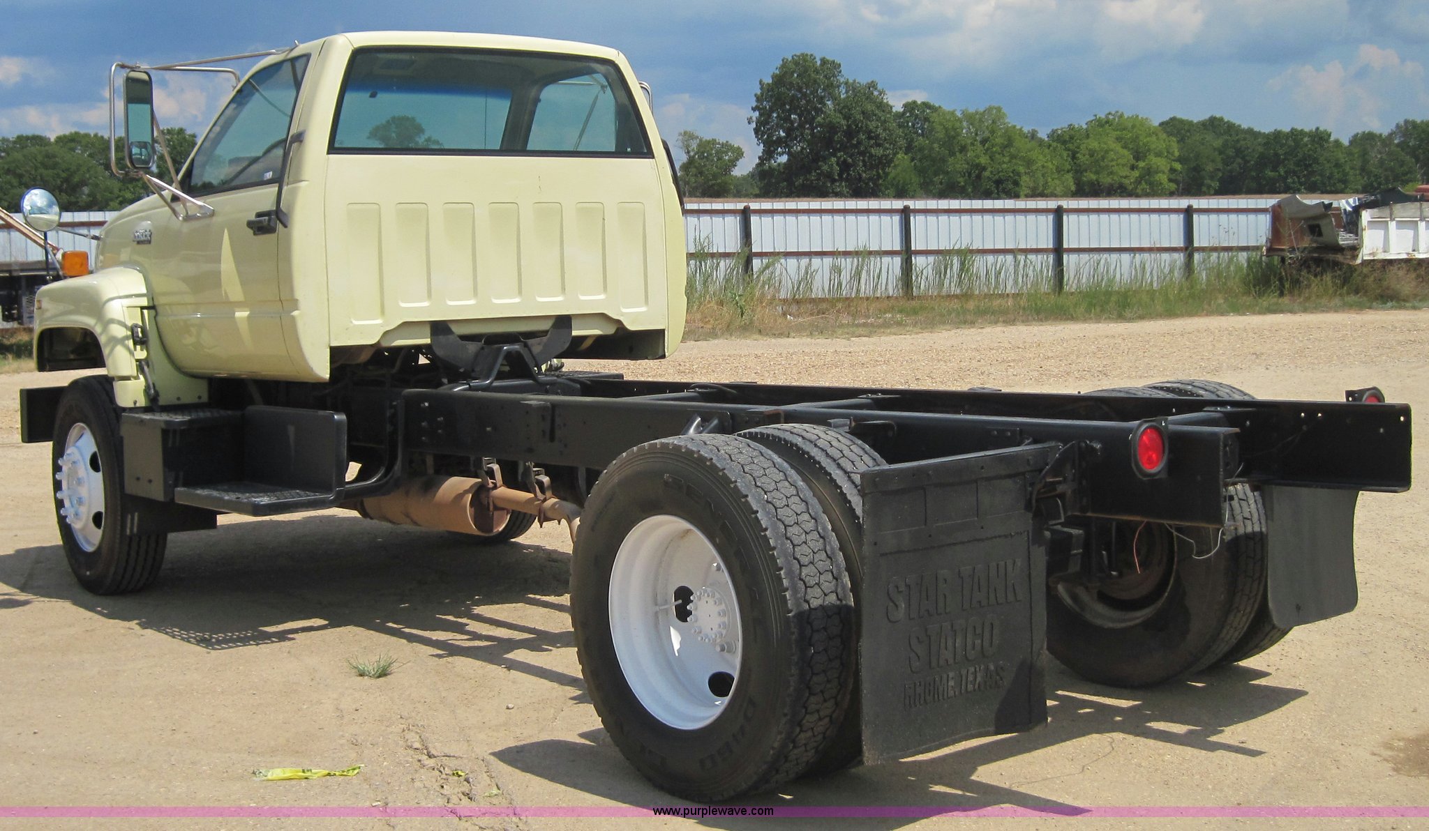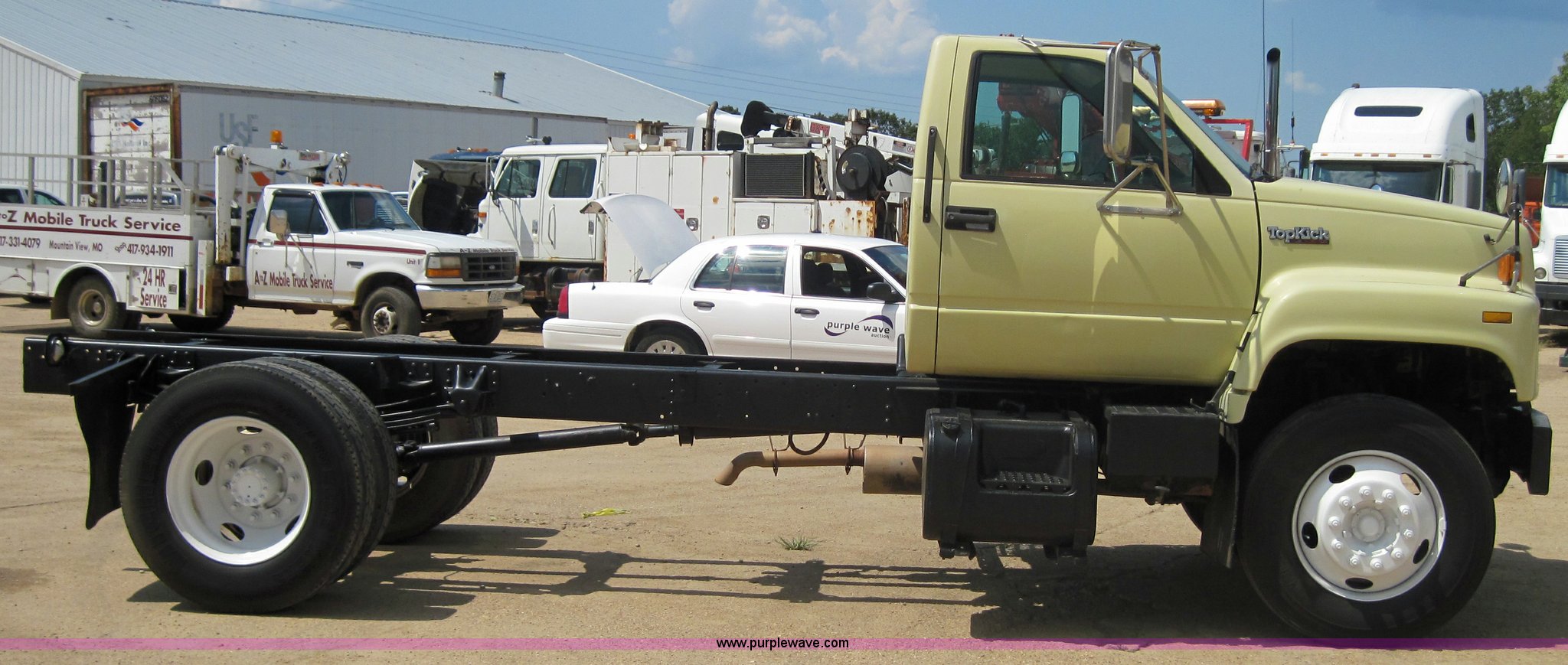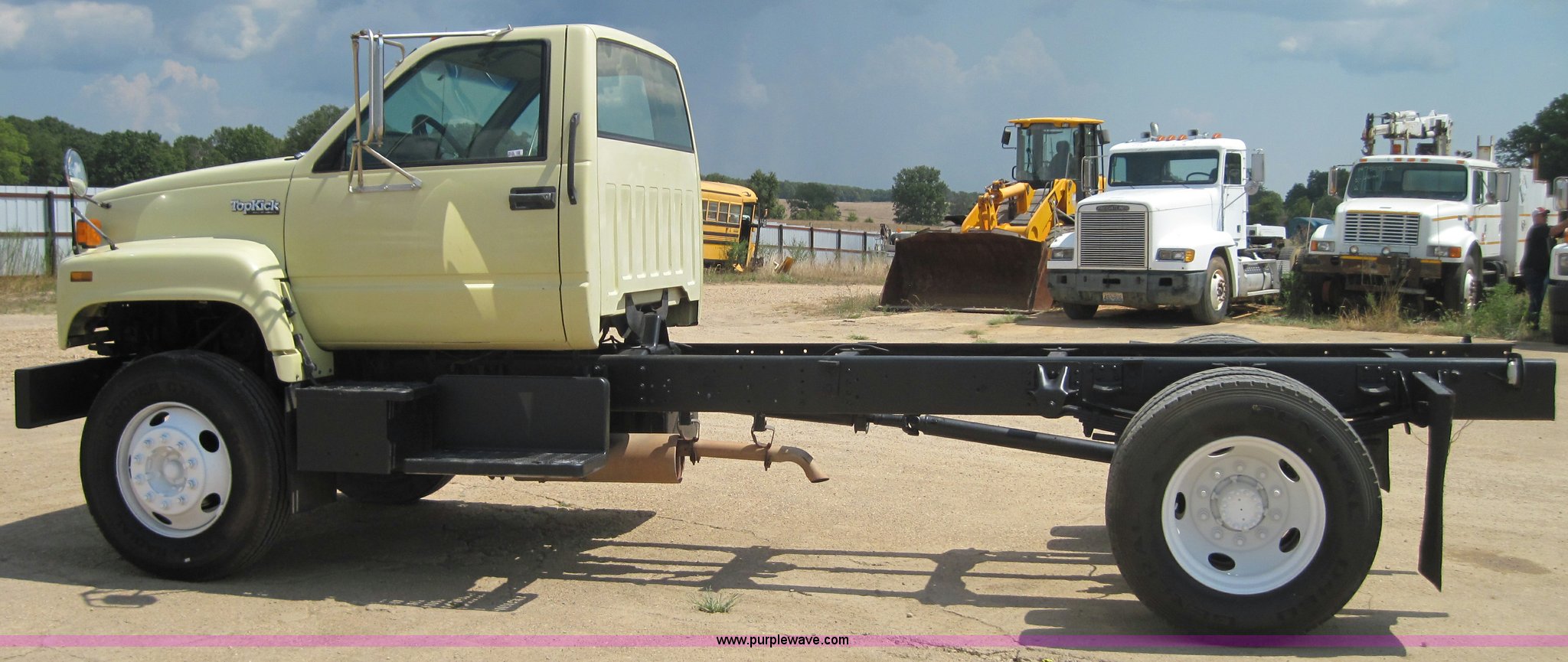 Purple Wave is selling a used Truck Chassis in Missouri. This item is a 1995 GMC Topkick C7H042 truck with the following: 228,253 miles on odometer, 4735 hours on meter, GM V-8 6.0L gas engine, Five speed manual transmission with split differential, Single fuel tank, Single stack, Hydraulic brakes, Spring suspension, Single axle, GVWR 30,000 lbs, GAWR front 8,100 lbs, GAWR rear 19,000 lbs, 176" wheel base, 295/75R22.5 tires, AC and heat, AM/FM radio