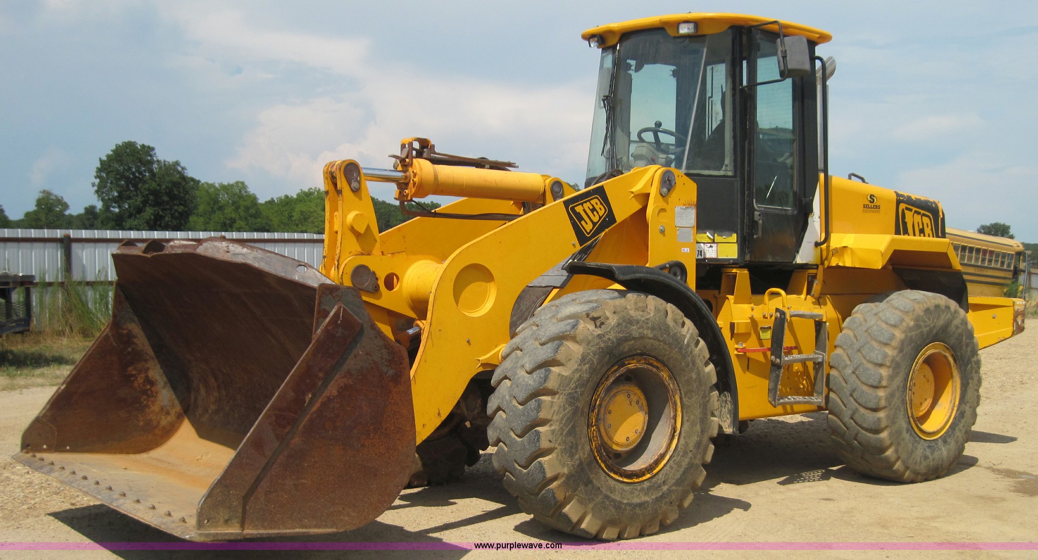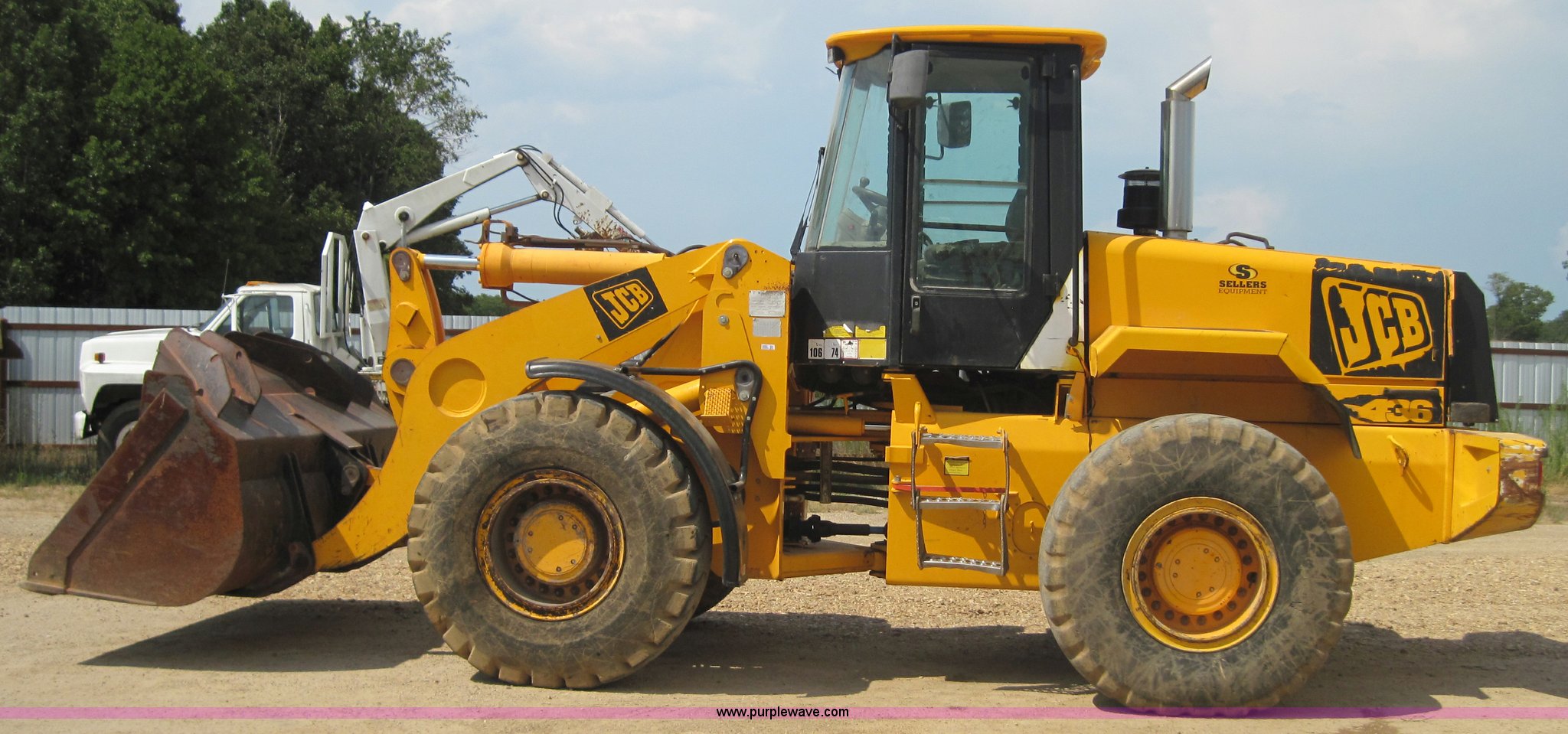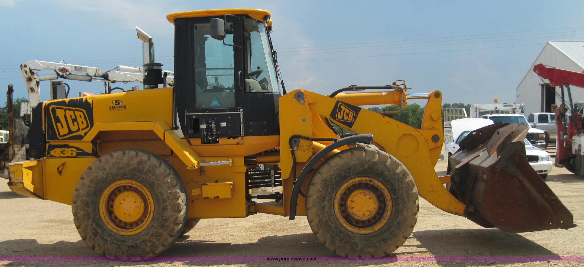 Purple Wave is selling a used Wheel Loader in Missouri. This item is a 2000 JCB 436 wheel loader with the following: 6688 hours on meter, Perkins six cylinder 150hp turbocharged diesel engine, 50 hours on engine overhaul, Four speed shuttle shift, Cab with A/C and Heat, ROPS, Single joystick loader control with third valve, 3.5 cubic yard GP bucket with bolt on edge, Counter weight package, 20.5-25 tires, 32,800 lbs. base operating weight, Serial 0533782