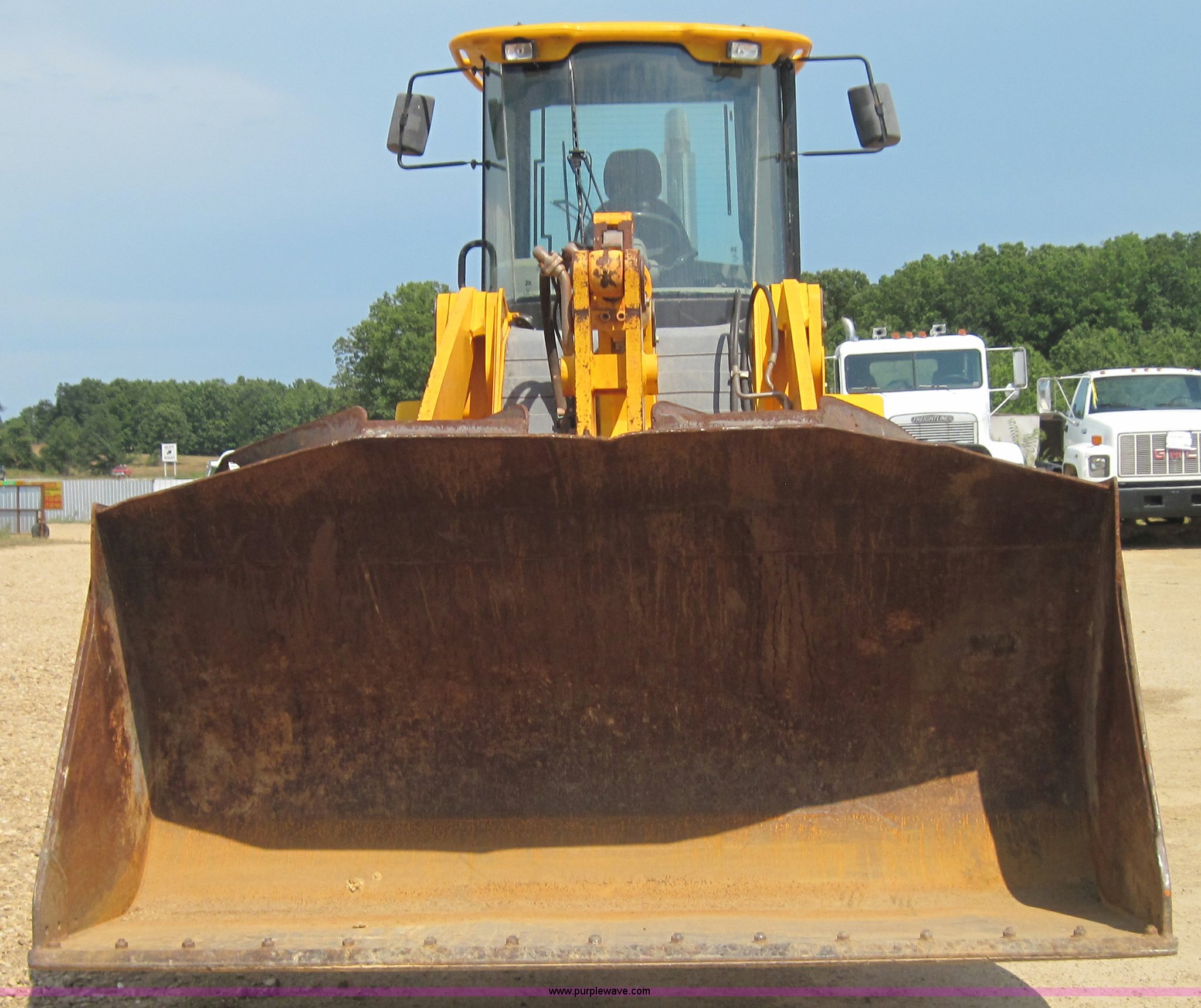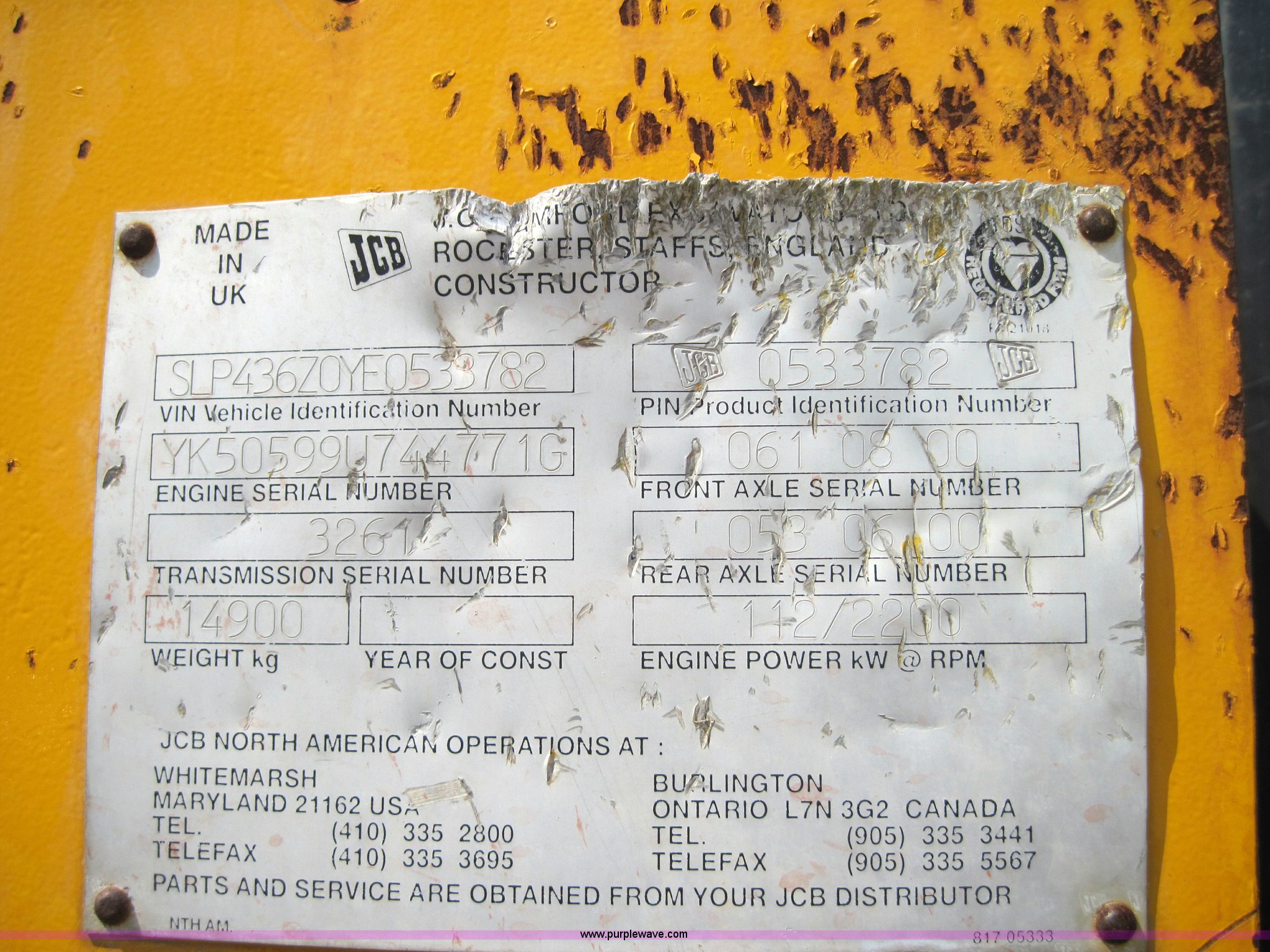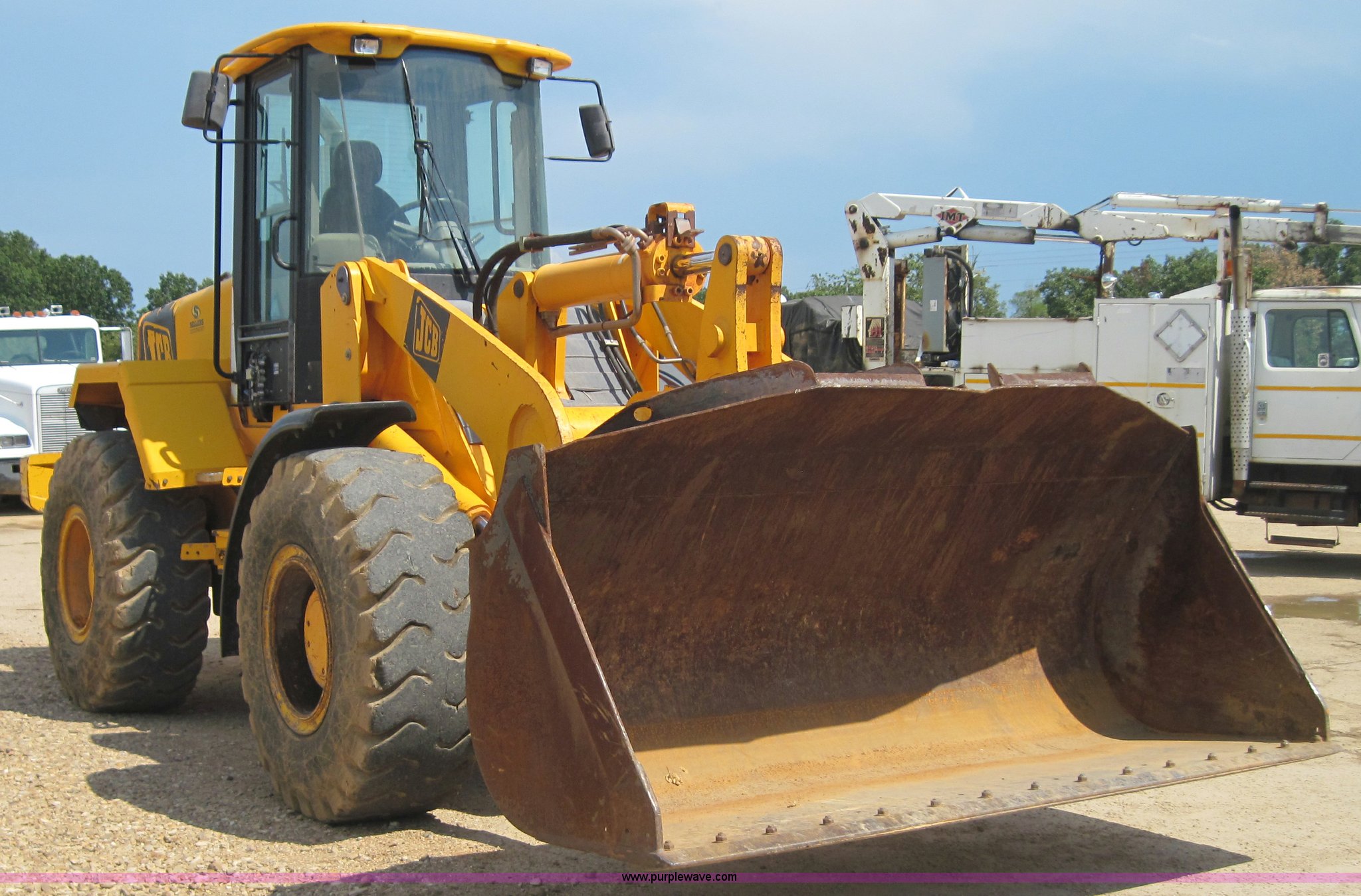 Purple Wave is selling a used Wheel Loader in Missouri. This item is a 2000 JCB 436 wheel loader with the following: 6688 hours on meter, Perkins six cylinder 150hp turbocharged diesel engine, 50 hours on engine overhaul, Four speed shuttle shift, Cab with A/C and Heat, ROPS, Single joystick loader control with third valve, 3.5 cubic yard GP bucket with bolt on edge, Counter weight package, 20.5-25 tires, 32,800 lbs. base operating weight, Serial 0533782
