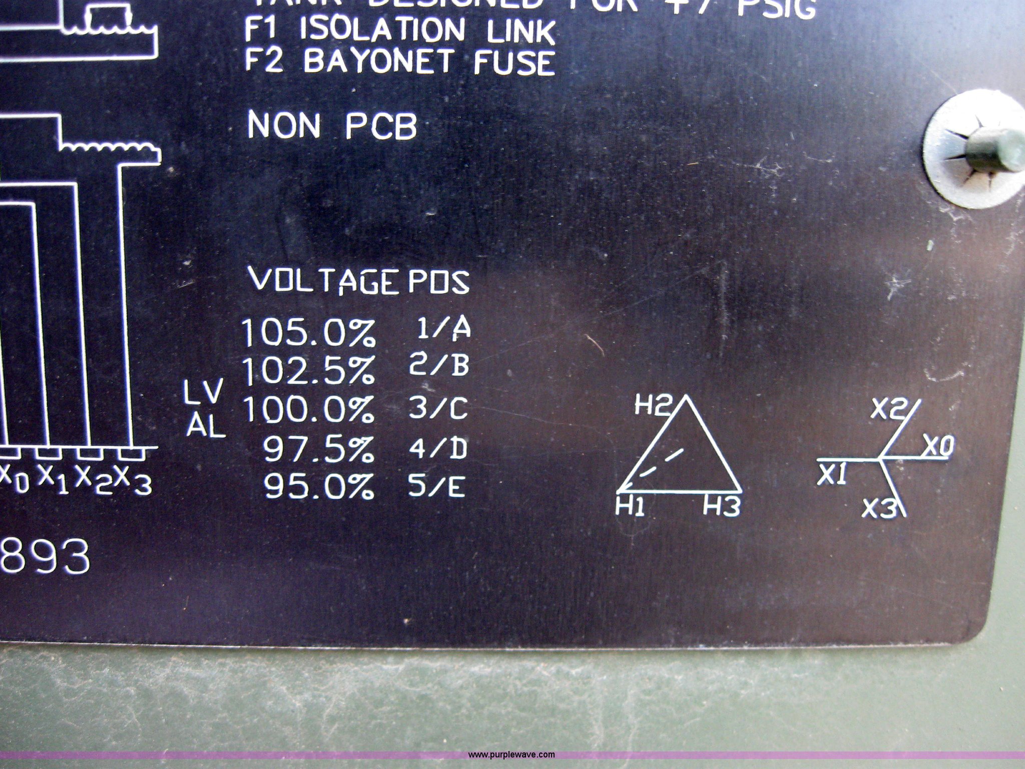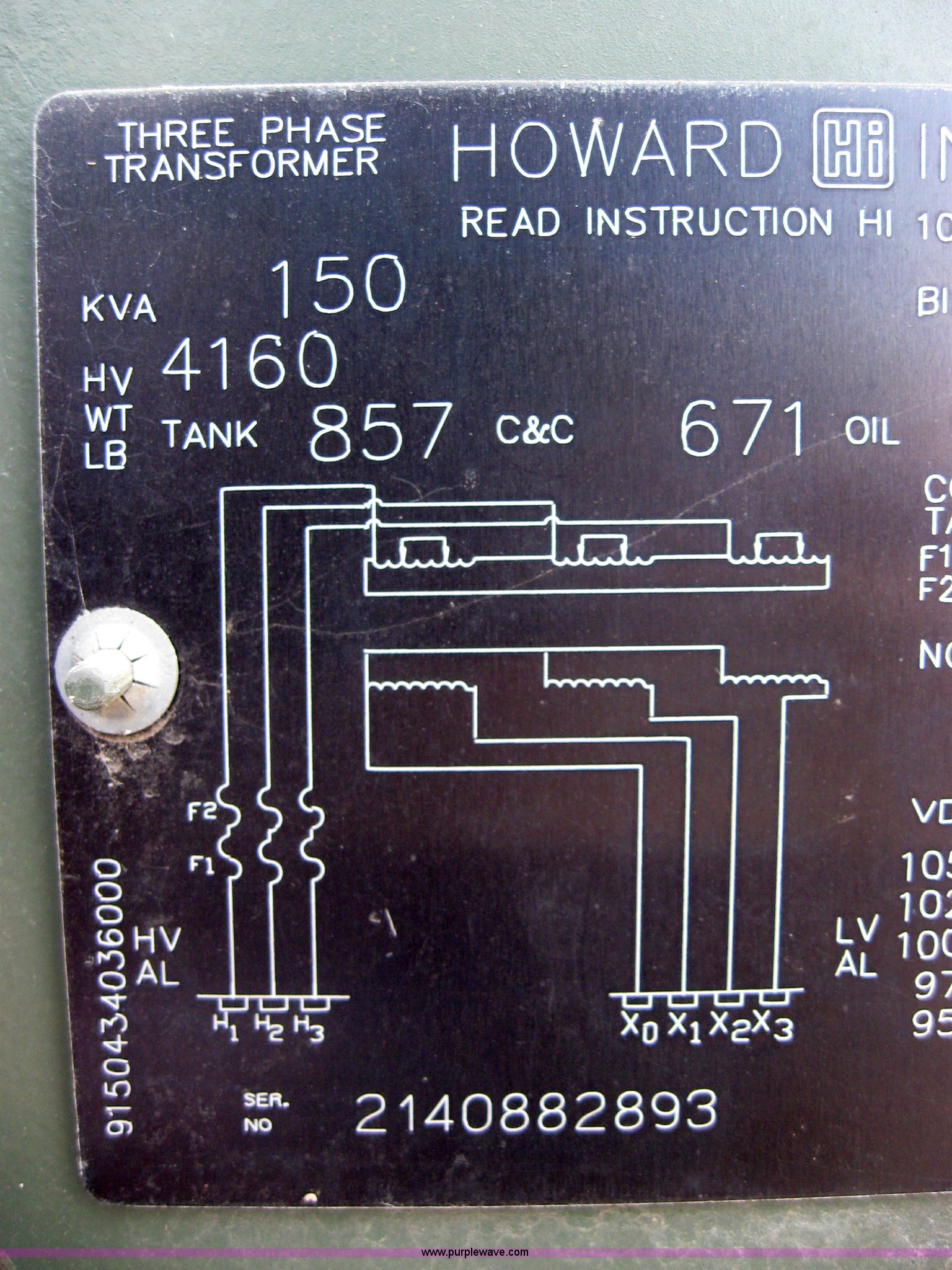 Purple Wave is selling a used Tools in Kansas. This item is a Howard Industries KVA 150 transformer with the following: Three phase, 60 HZ, LV208Y/120, 2,376 lbs., 113 gallon oil reservoir, Certified PCB free oil, Current certification, Delta Y, Serial 2140882893