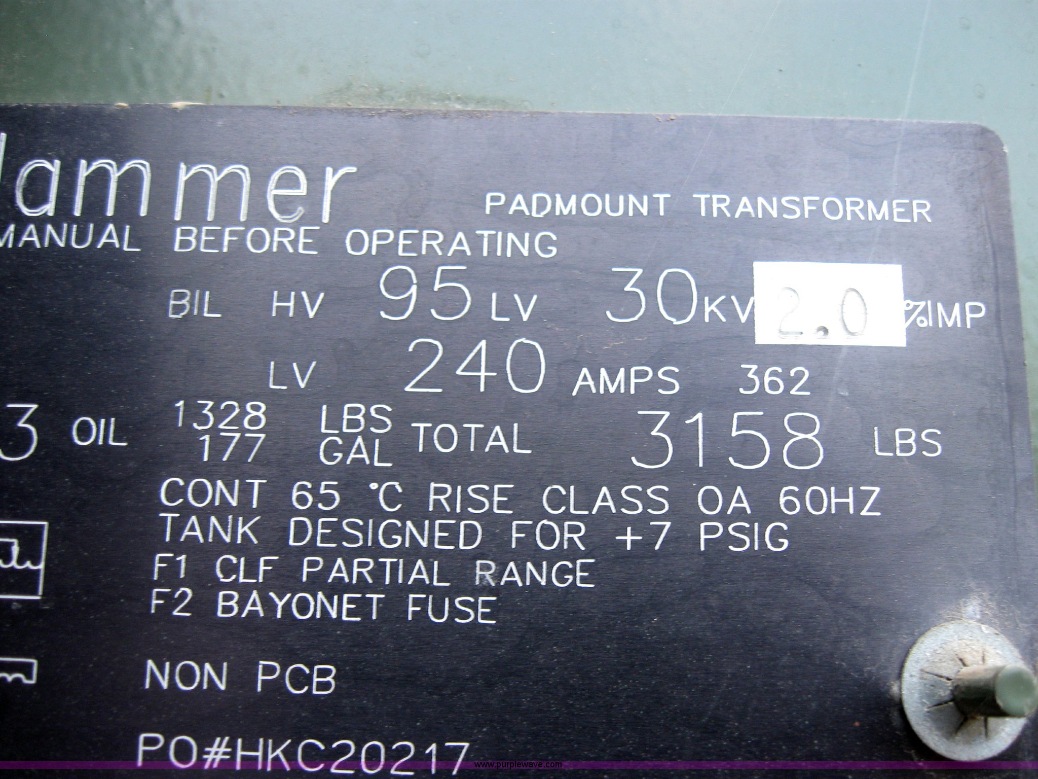 Purple Wave is selling a used Tools in Kansas. This item is a Cutler Hammer KVA 150 transformer with the following: Three phase, 60 Hz, LV240, 3,158 lbs, 177 gallon oil reservoir, Certified PCB free oil, Current certification, Delta Delta, Serial 144764087