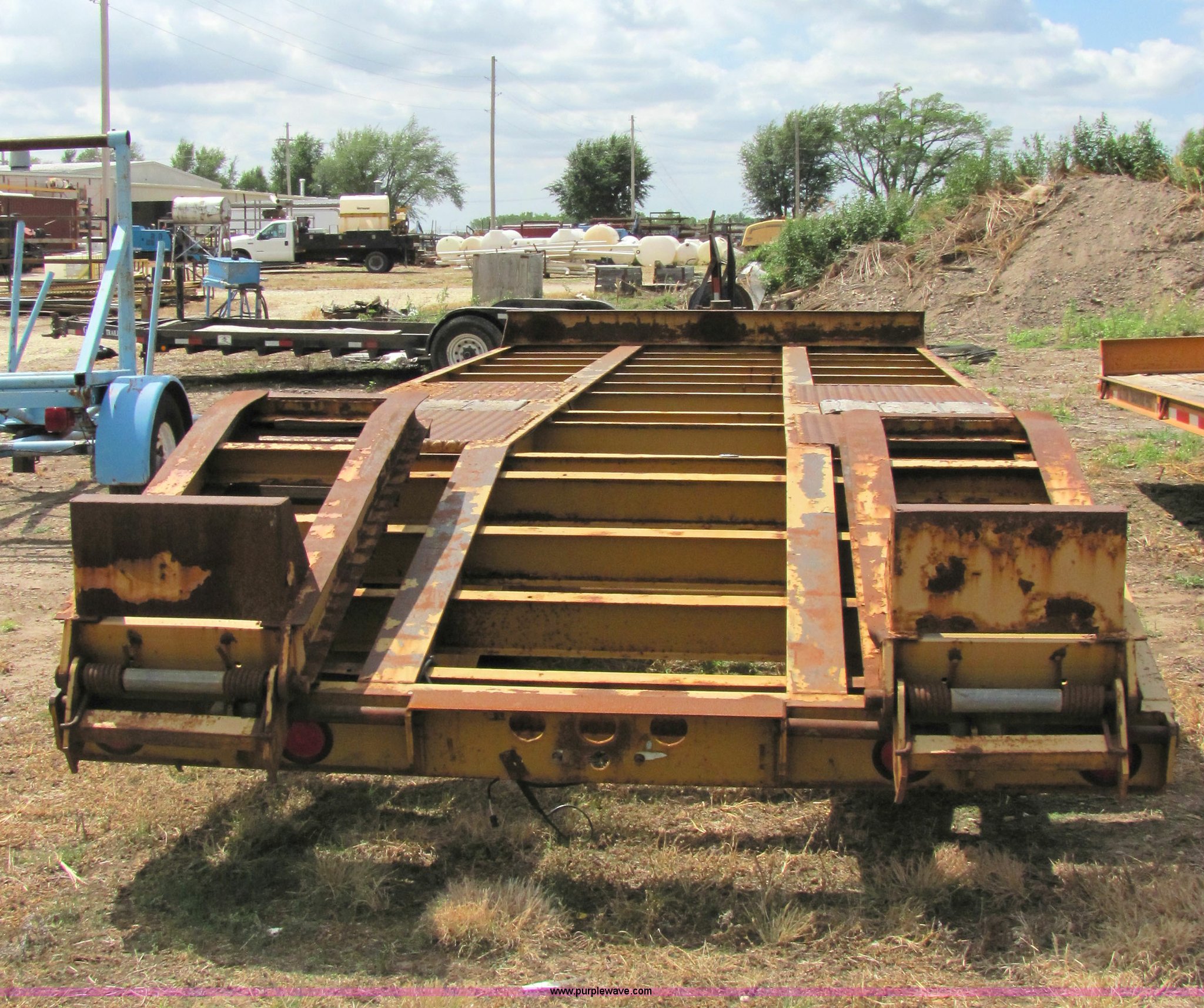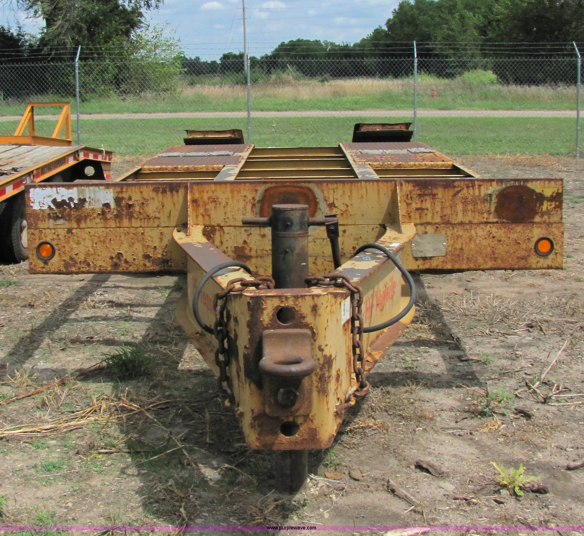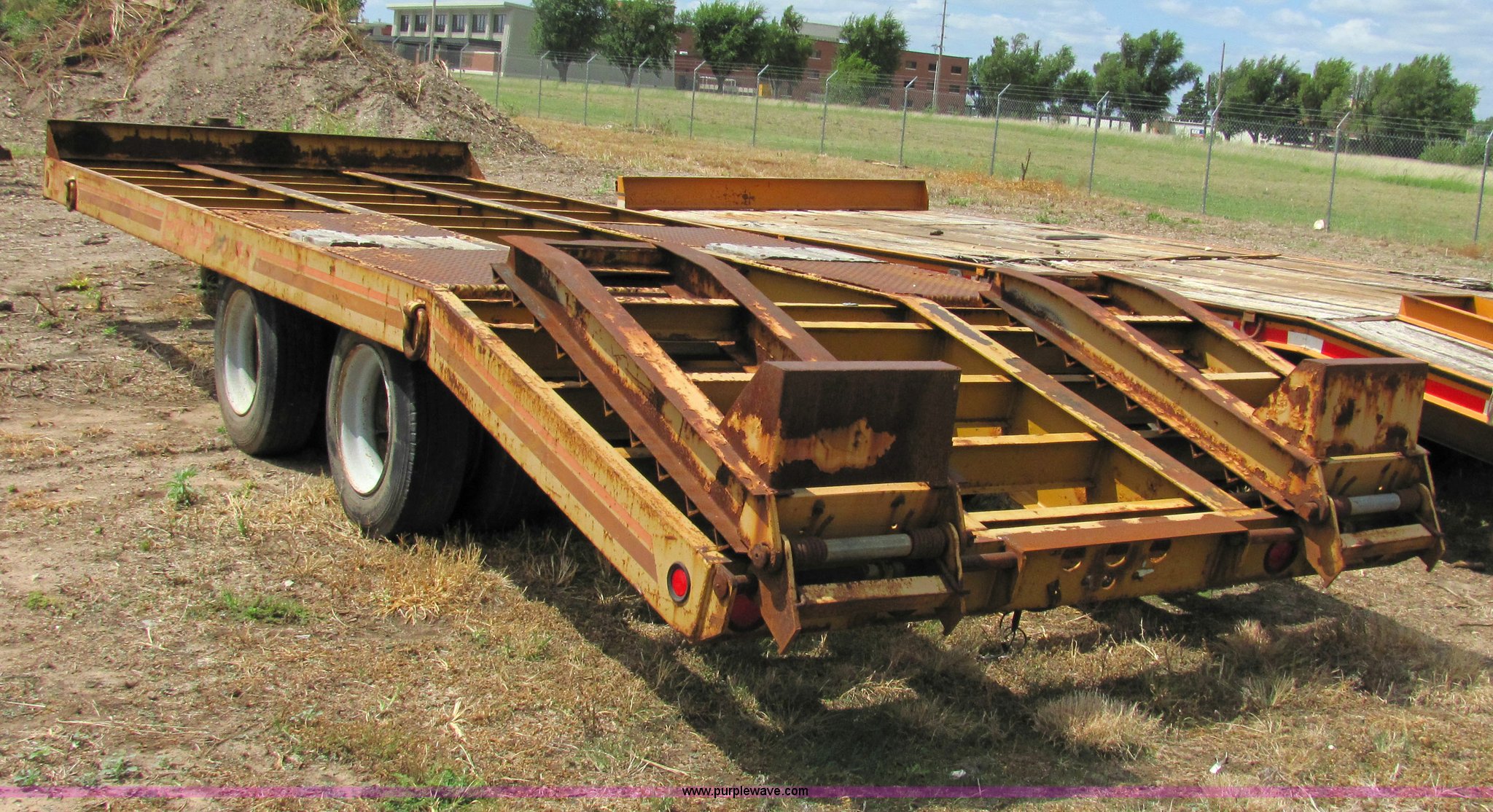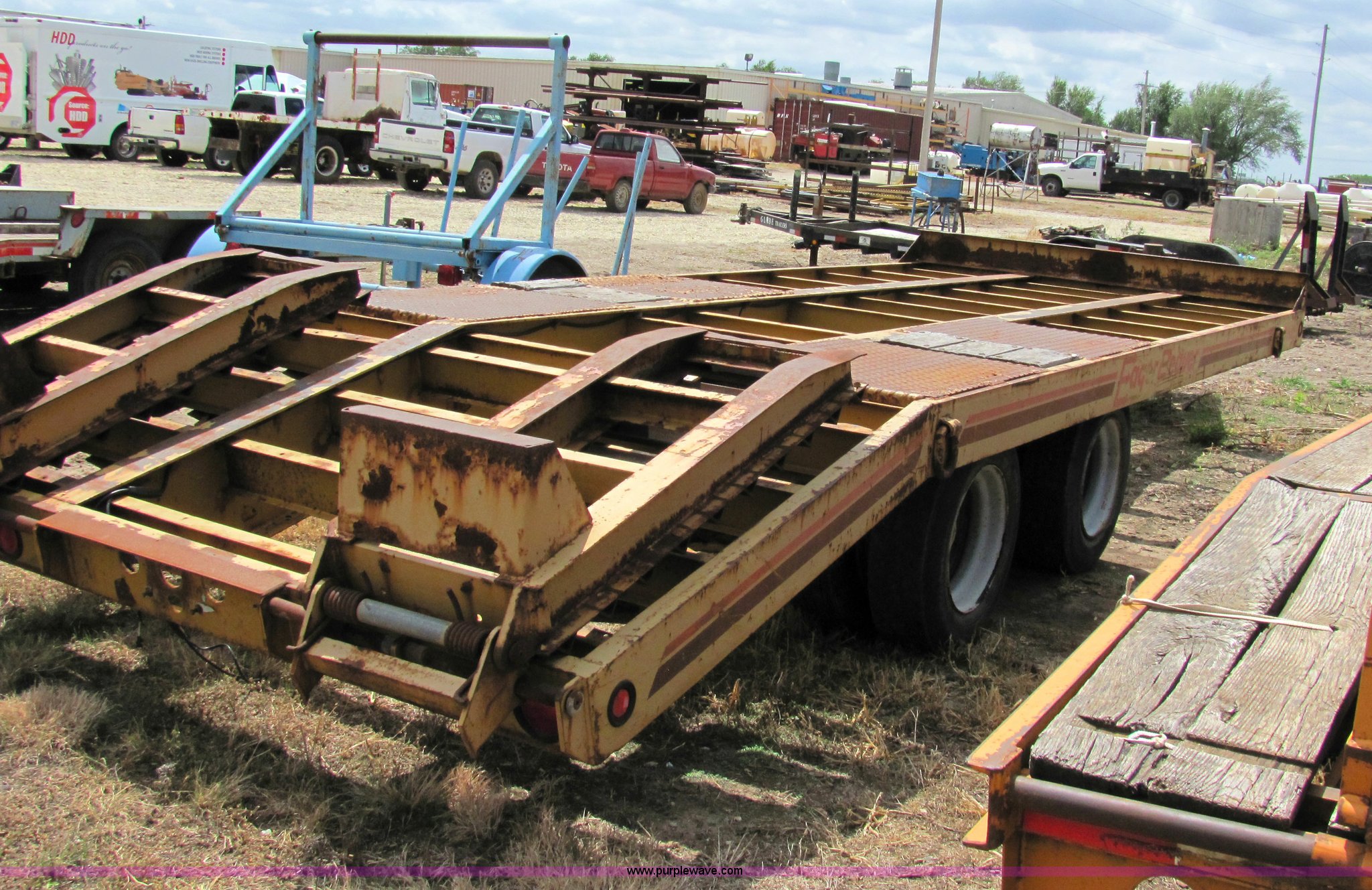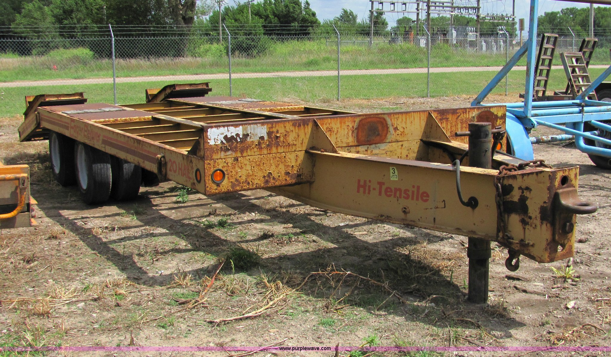 Purple Wave is selling a used Equip. Trailer in Kansas. This item is a 1990 Hi Tensile Eager Beaver 28' flat bed trailer with the following: Dual axles with dual tires, GVWR 47,100 lbs, Pintle hitch, 17' deck, 5' dove tail, 4.5' fold up ramps, 215/75R17.5 tires, ID# 9800-134