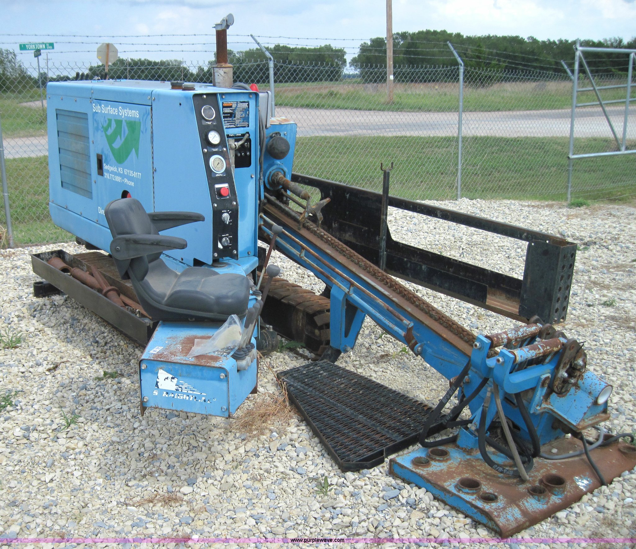 Purple Wave is selling a used Directional Boring Unit in Kansas. This item is a Straightline 910 directional drill with the following: 2874 hours on meter, Hatz three cylinder diesel engine, Hydrostatic transmission, 10" metal tracks, Operational
