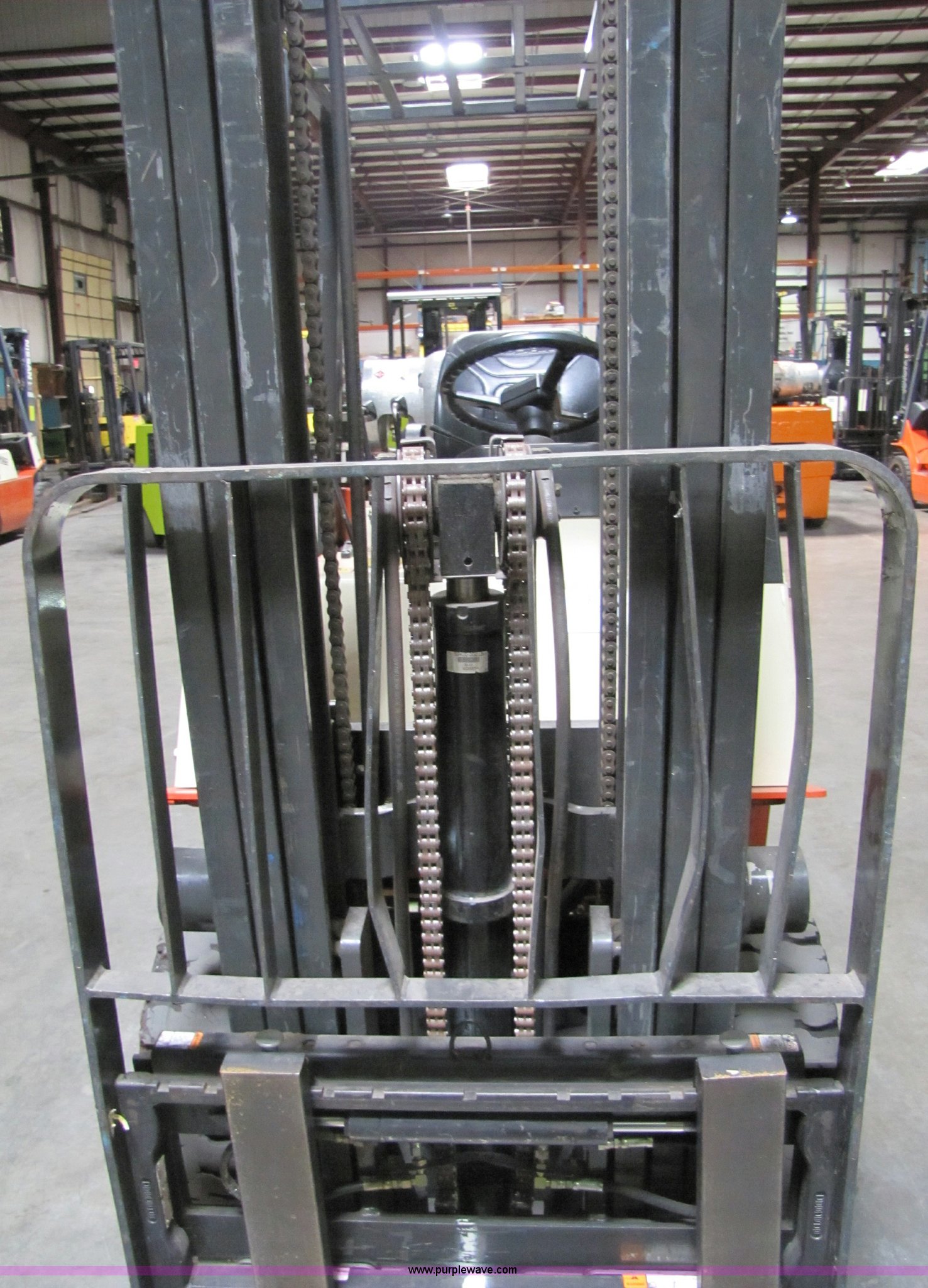 Purple Wave is selling a used Cushion Tire or Pneumatic Forklift in Kansas. This item is a 2003 Nissan 50 forklift with the following: 4703 hours on meter, Model CPJ02A25PV, Propane engine, 187" max lift height, 4,400 lbs capacity, 8,460 lbs. base operating weight, Mast# N3FW475, New starter