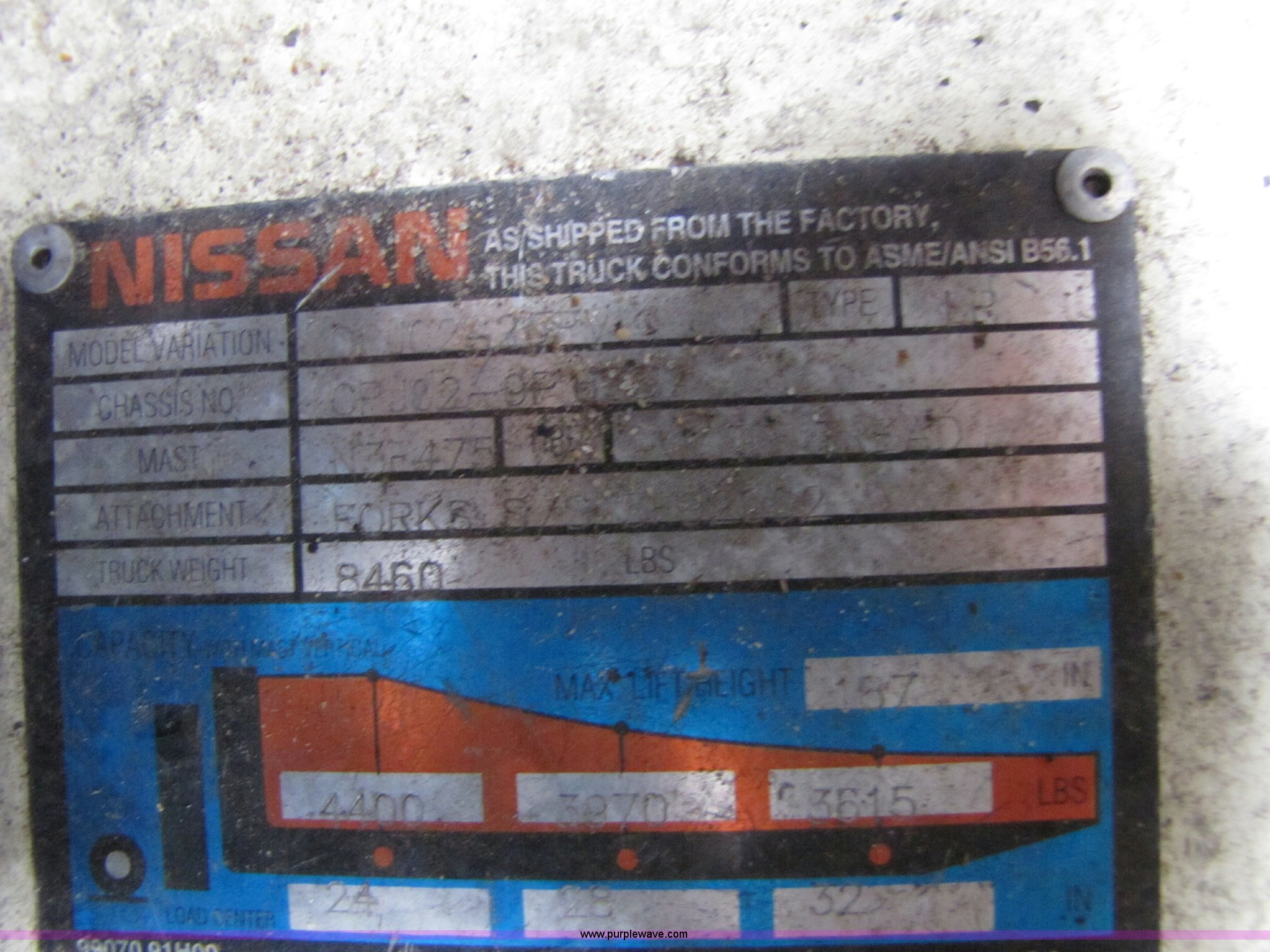 Purple Wave is selling a used Cushion Tire or Pneumatic Forklift in Kansas. This item is a 2001 Nissan 50 forklift with the following: 6433 hours on meter, Model CPJ02A25PV, Propane engine, 187" max lift height, 4,400 lbs capacity, 8,460 lbs. base operating weight, Mast# N3F475