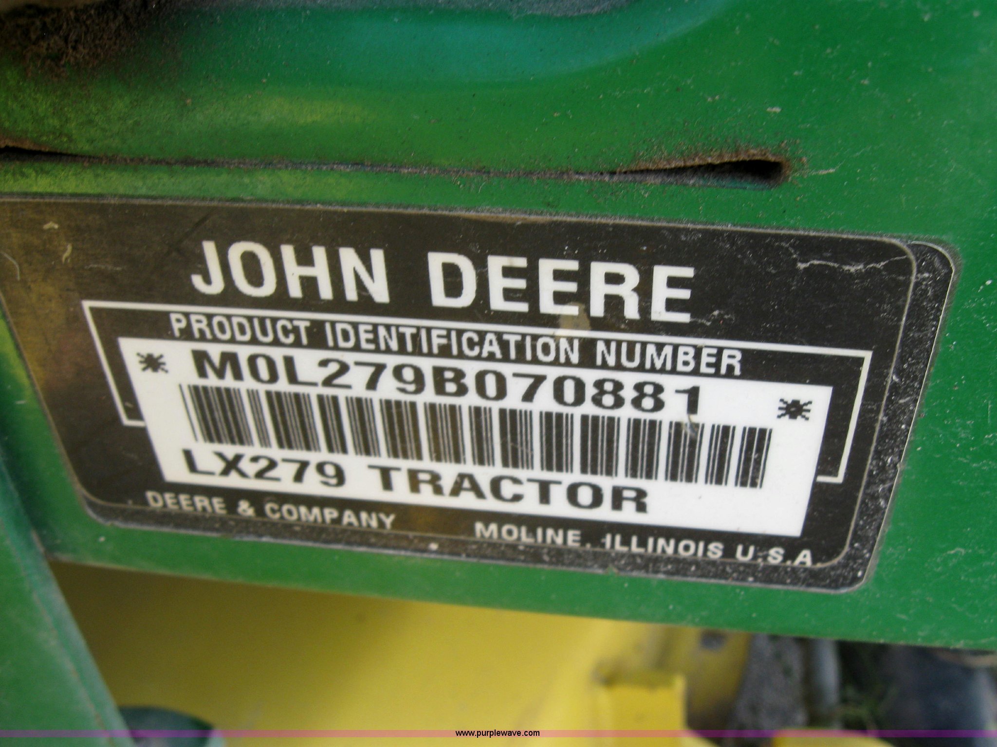 Purple Wave is selling a used Lawn and Garden in Kansas. This item is a John Deere LX279 mower with the following: 555 hours on meter, Kawasaki 17hp V-twin liquid cooled engine, 48C convertible 48" deck, Twin-touch automatic transmission, Serial MOL279B070881