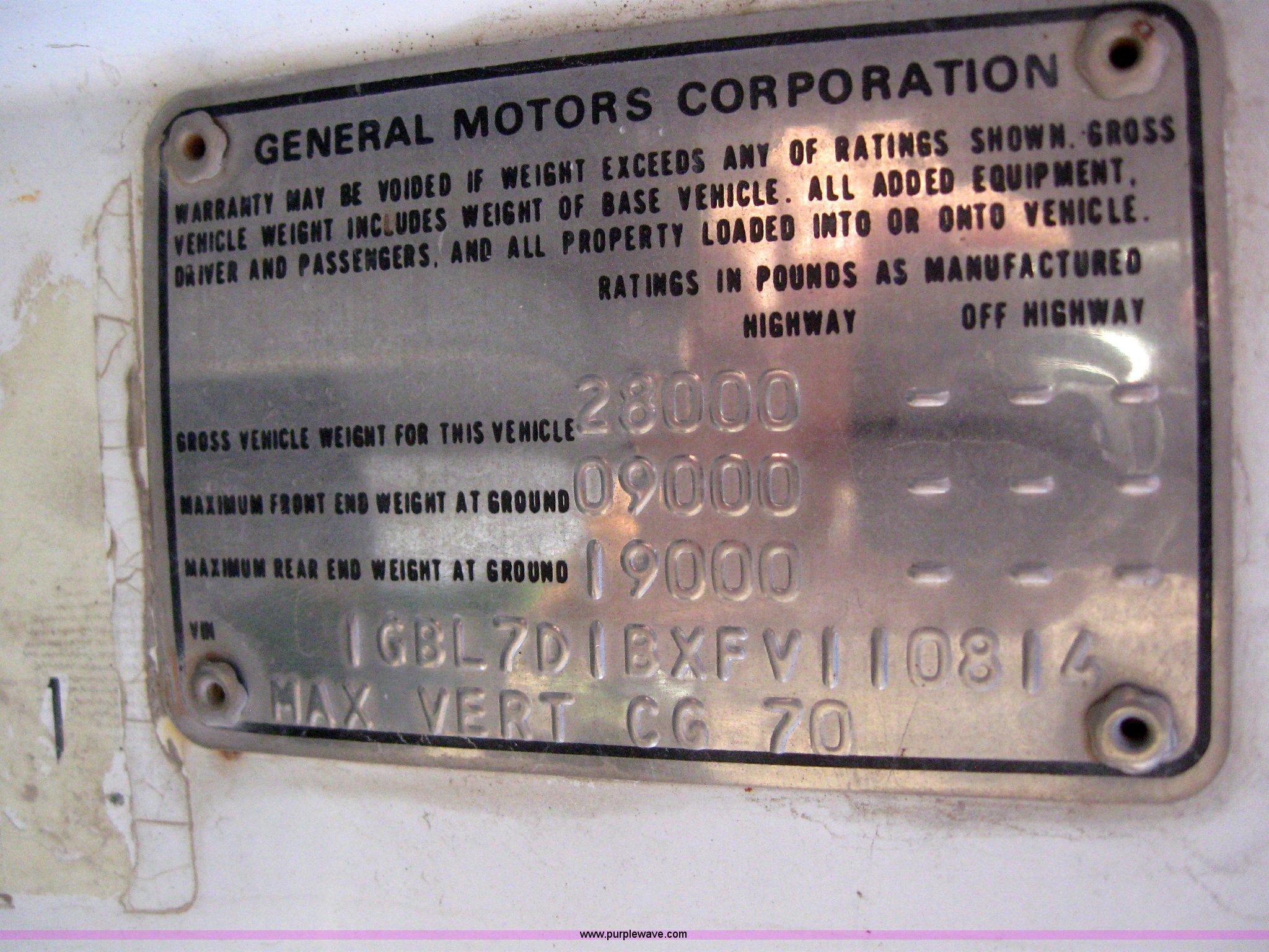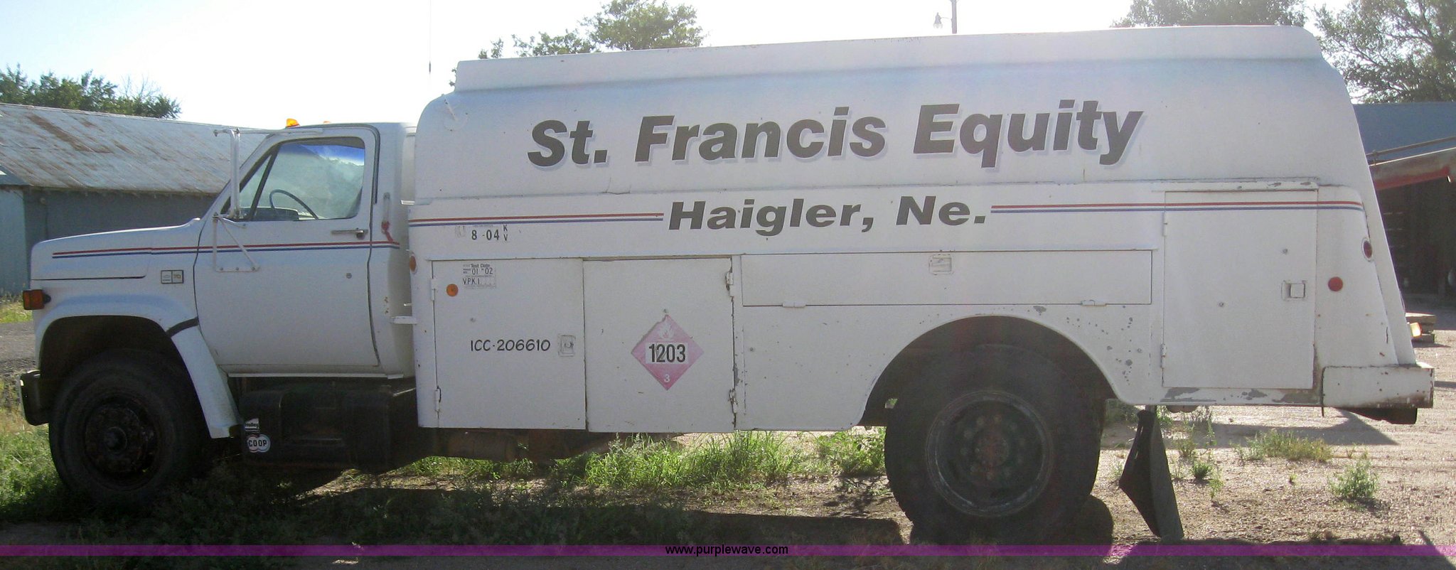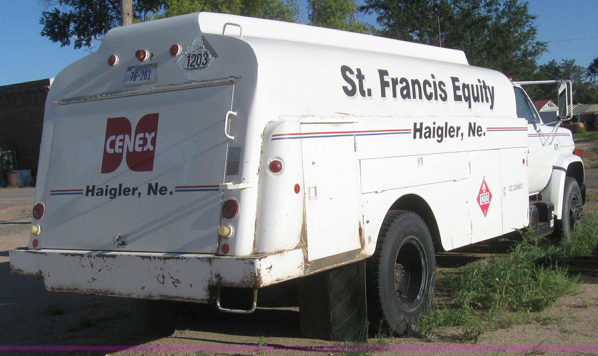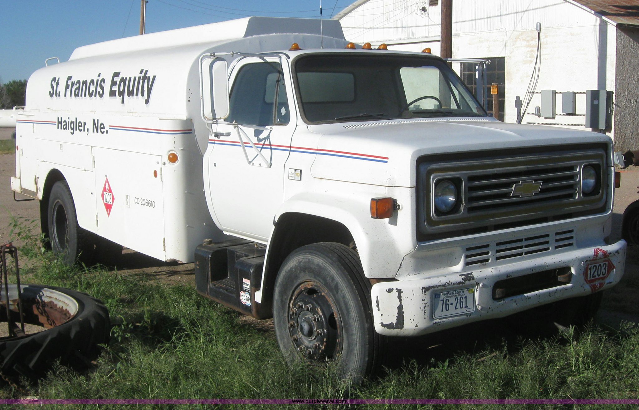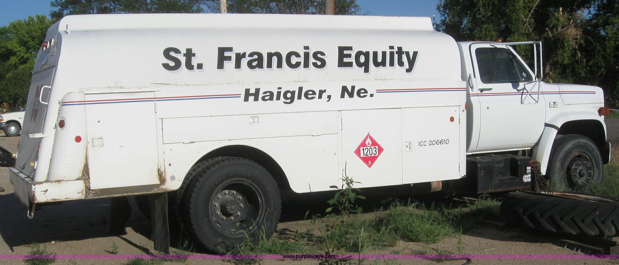 1985 Chevrolet 70 fuel truck. 154,309 miles on odometer, GM V8, 6.0L (366 CID) gas engine, Five speed transmission with split differential, 9.00R20 tires, 1985 Tri-State 800B fuel tank 2,000 gallon capacity, Five separate tanks 600 gallon tank, 500 gallon tank, 400 gallon tank, 300 gallon tank, 200 gallon tank, (2) pumps with gallon meters, Seat will be installed before auction. 1GBL7D1BXFV110814. Shipping quotes available. St. Francis Equity. 109 North Porter Ave. Haigler, NE 69030