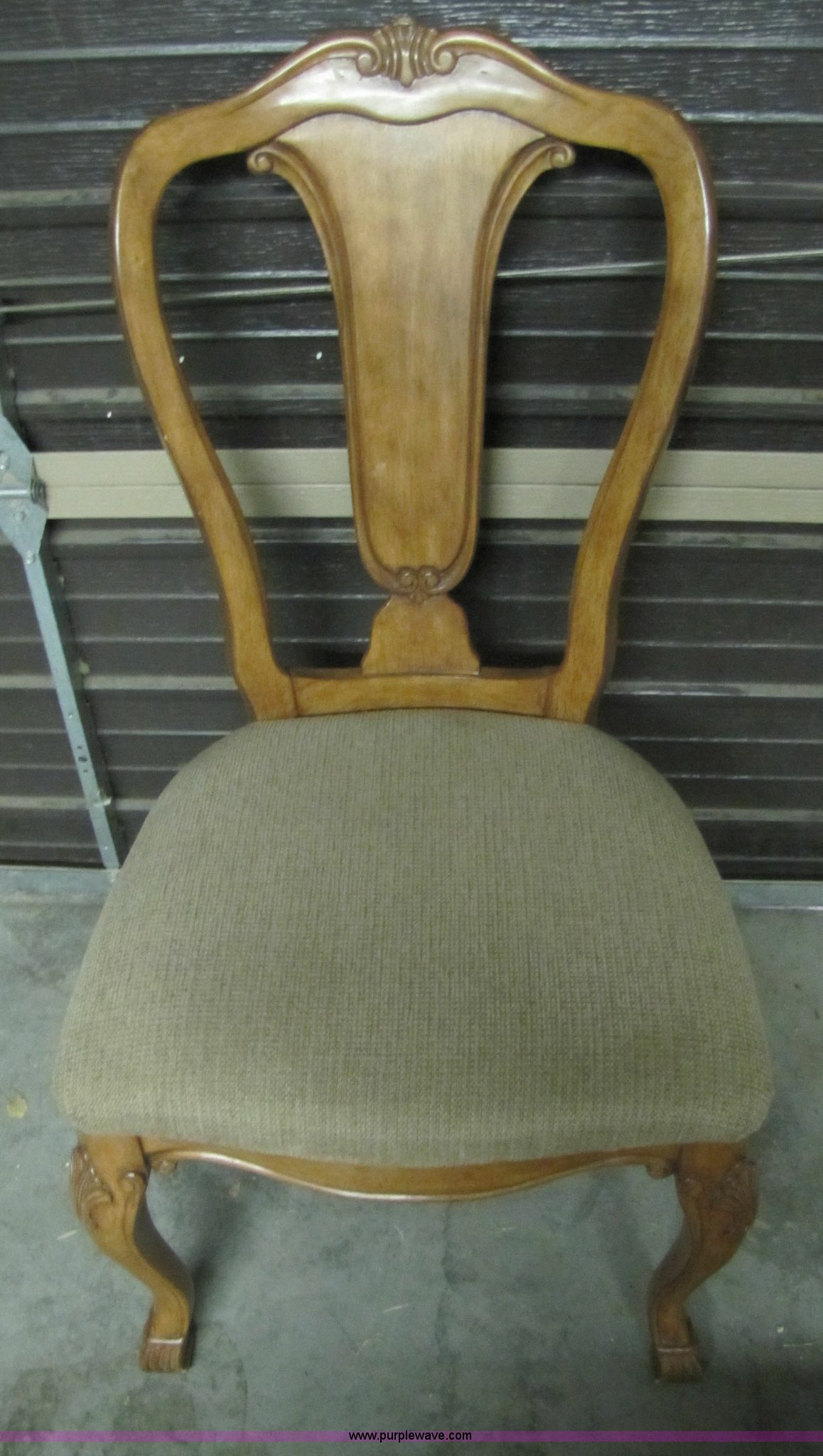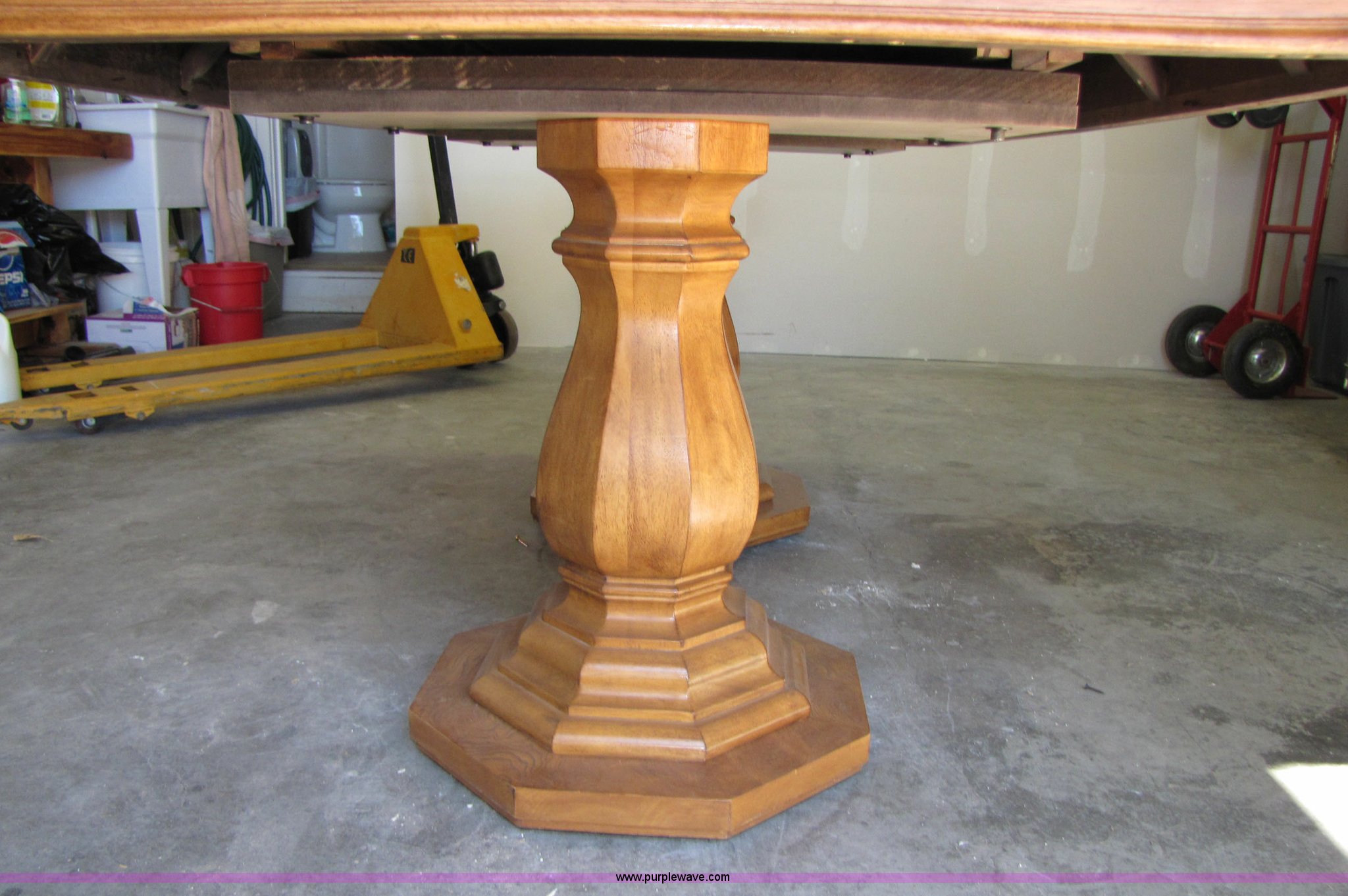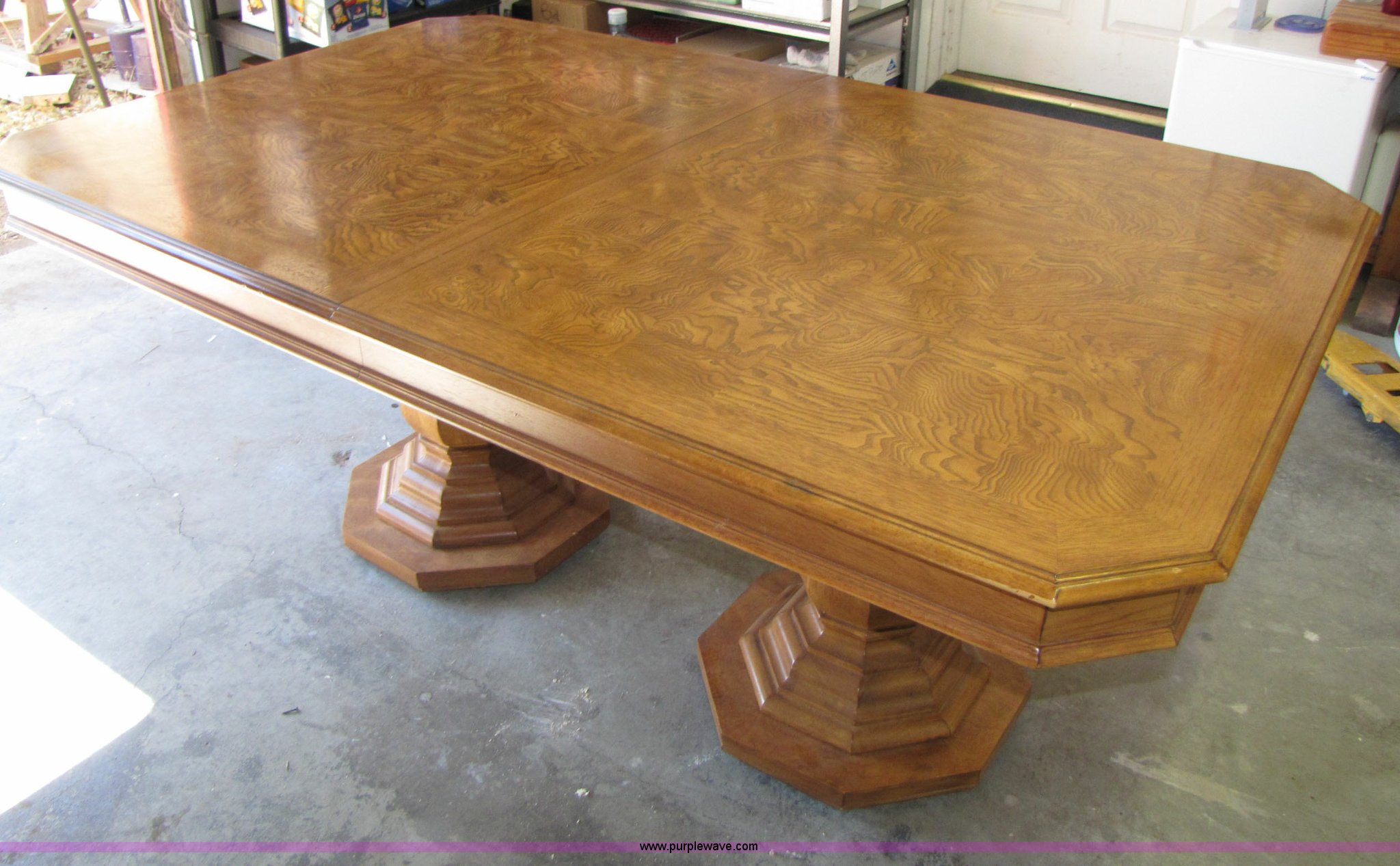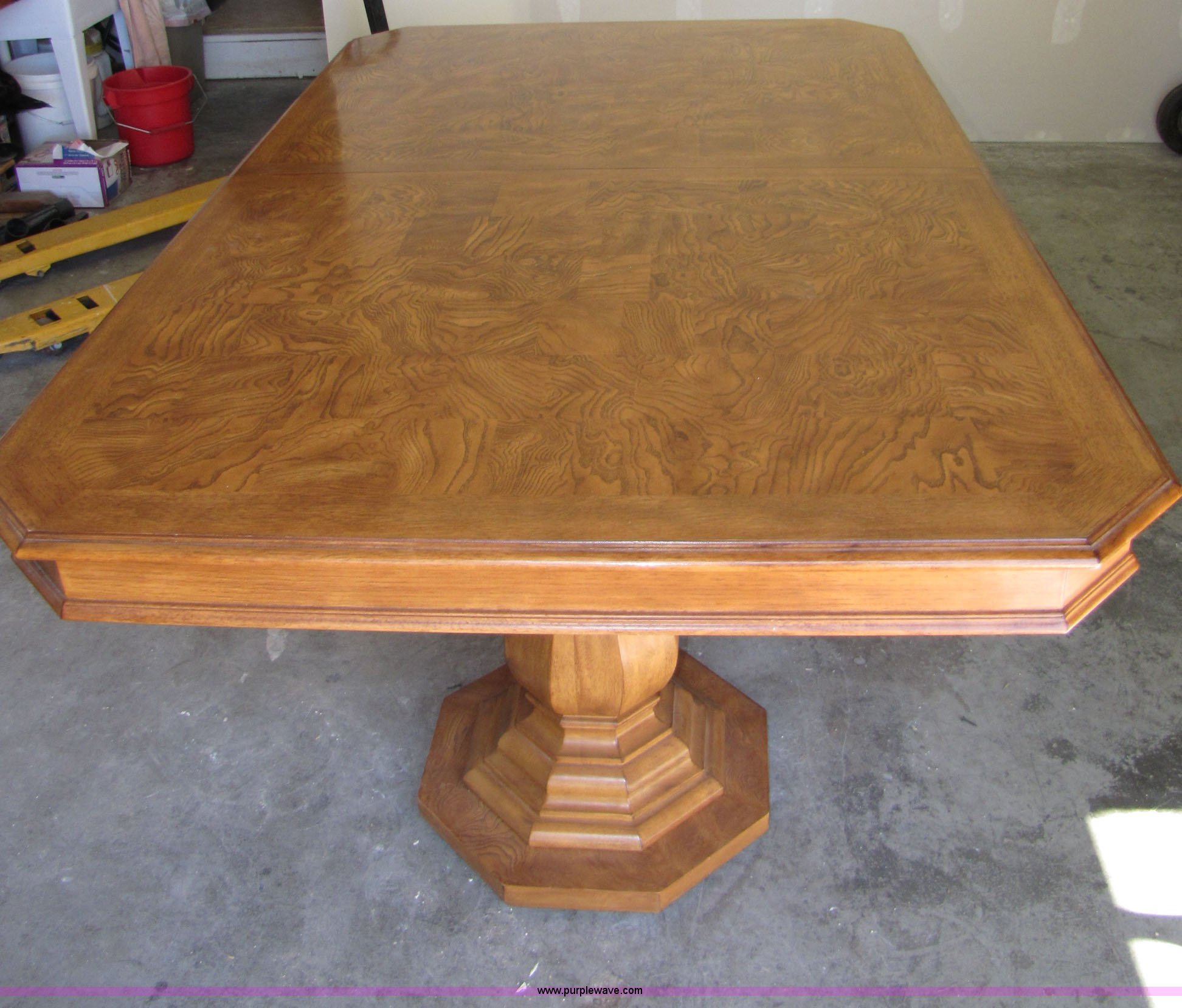 Purple Wave is selling a used Furniture in Nevada. This item is a 6' pecan table and chairs with the following: 6' pecan table and chairs. 2 table leaves extend table to 10'. 2 captian chairs. 6 regular chairs. Chairs newly recovered. Purple Wave Sierra. 5853 S Carson Street. Carson City, NV 89701