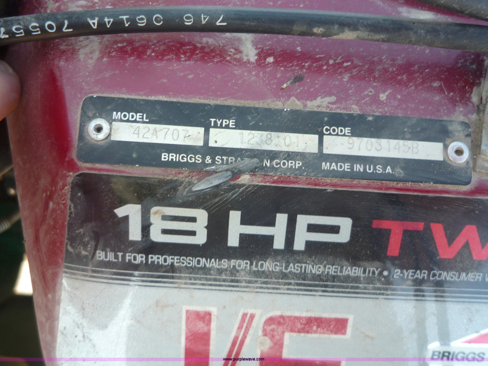 Power Pro 42" cut riding lawn mower. Briggs & Stratton 18hp Twin II I/C engine, Model 13AQ673G12 525234-118, Serial 1C257B40146. Shipping quotes available. 825 Levee Dr.. Manhattan, KS 66502