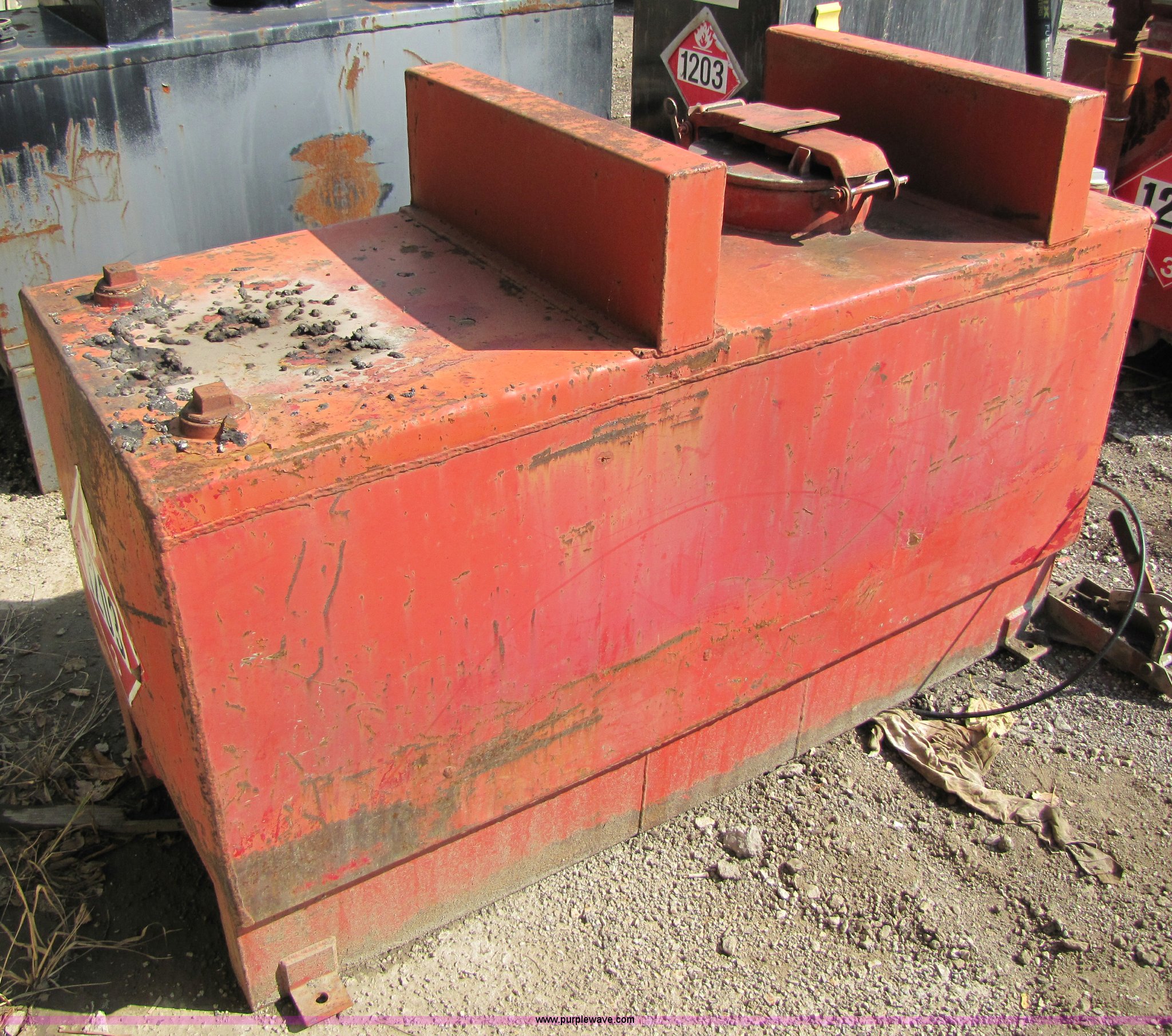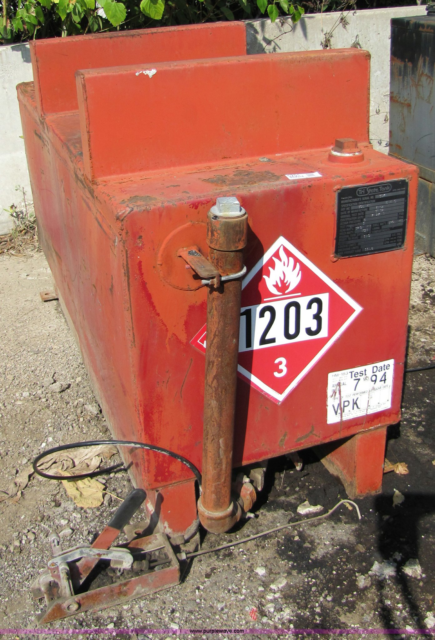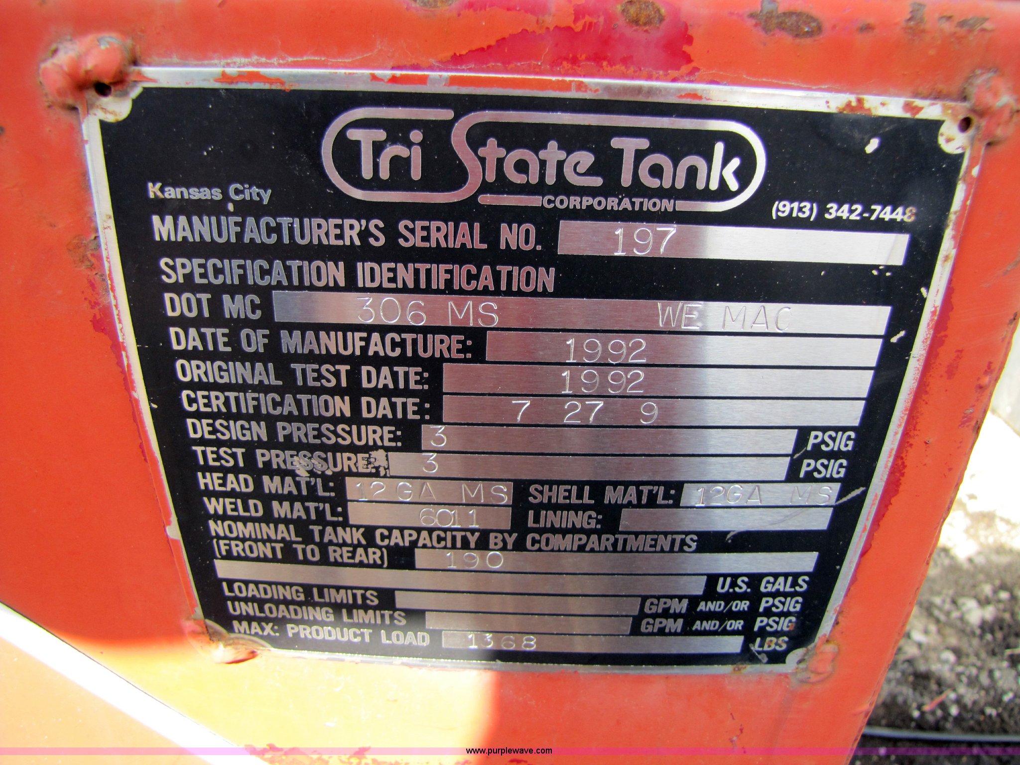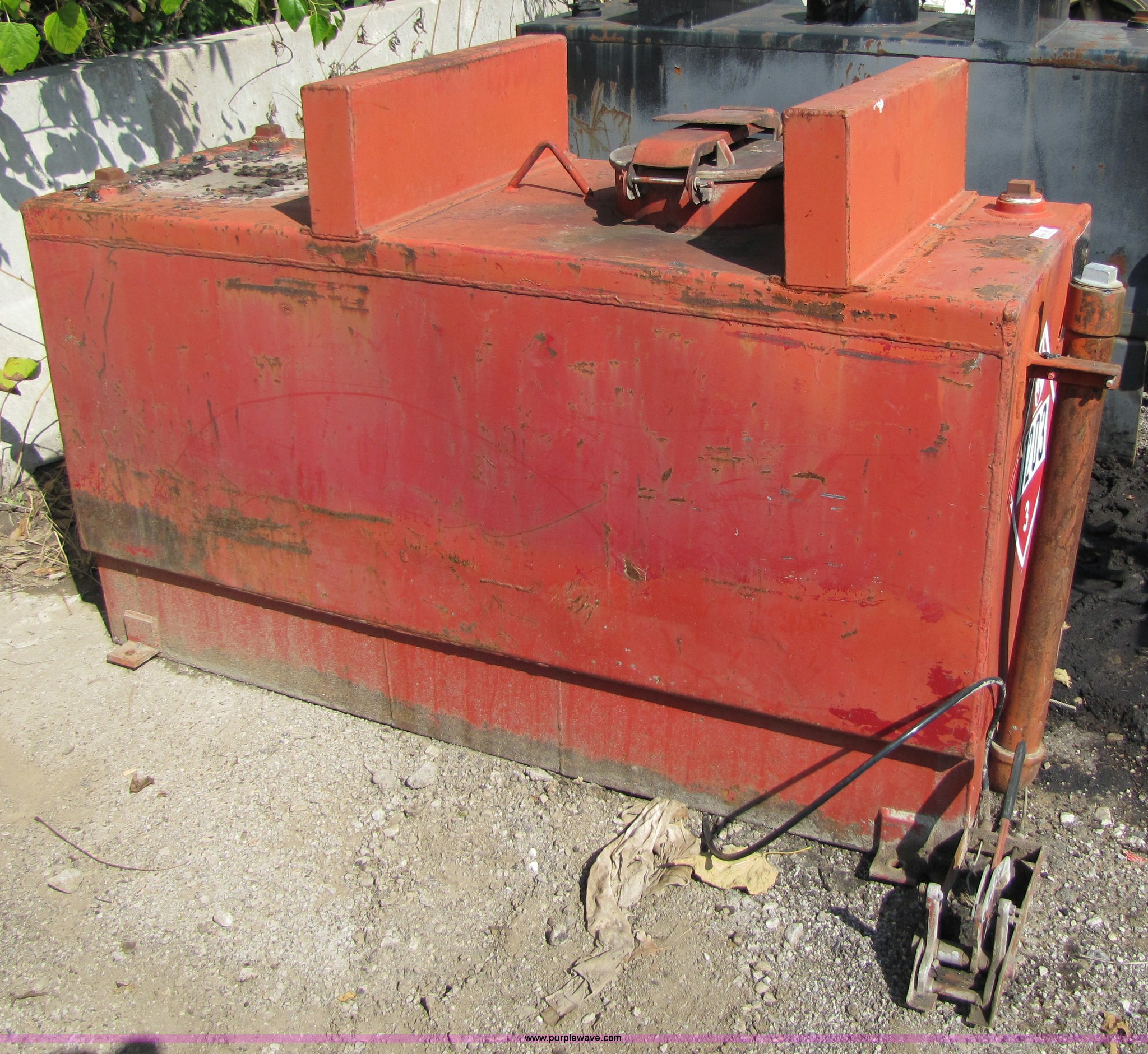 Purple Wave is selling a used Fuel and Lube in Missouri. This item is a 1992 Tri-State fuel tank with the following: 190 gallon capacity, 5'L w 2'W x 3'4"H, Serial 197