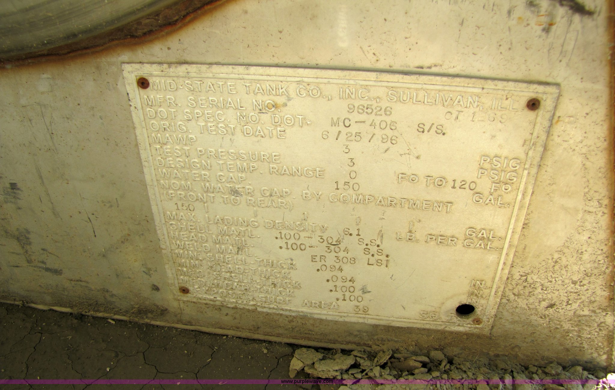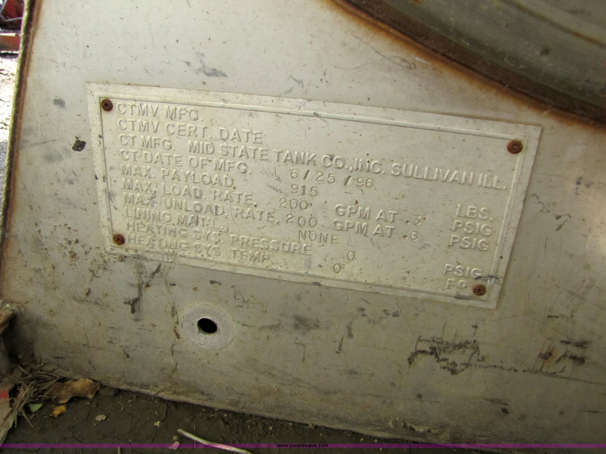 Purple Wave is selling a used Fuel and Lube in Missouri. This item is a 1998 Mid-State stainless steel fuel tank with pump with the following: 150 gallon capacity, 4'8"L x 32"W x 3'10"H tank dimensions, Serial 96526