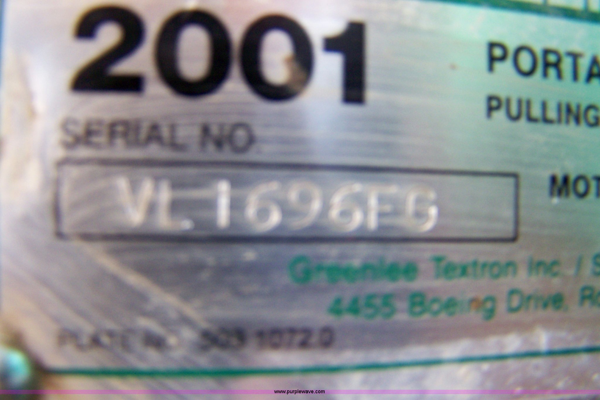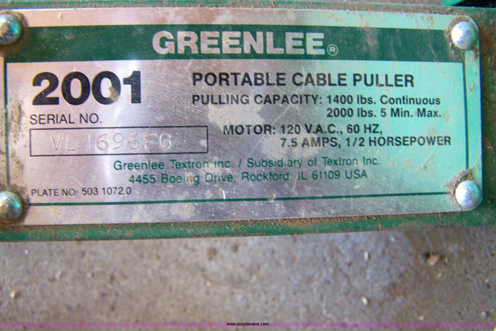 2001 Greenlee portable cable puller. 1,400 lbs continous pulling capacity, 2,000 lbs 5min max, 120 vac motor, 7.5 amps, Serial VL1696FG. Shipping quotes available. 2571 Fairground Rd. Victoria, KS 67671