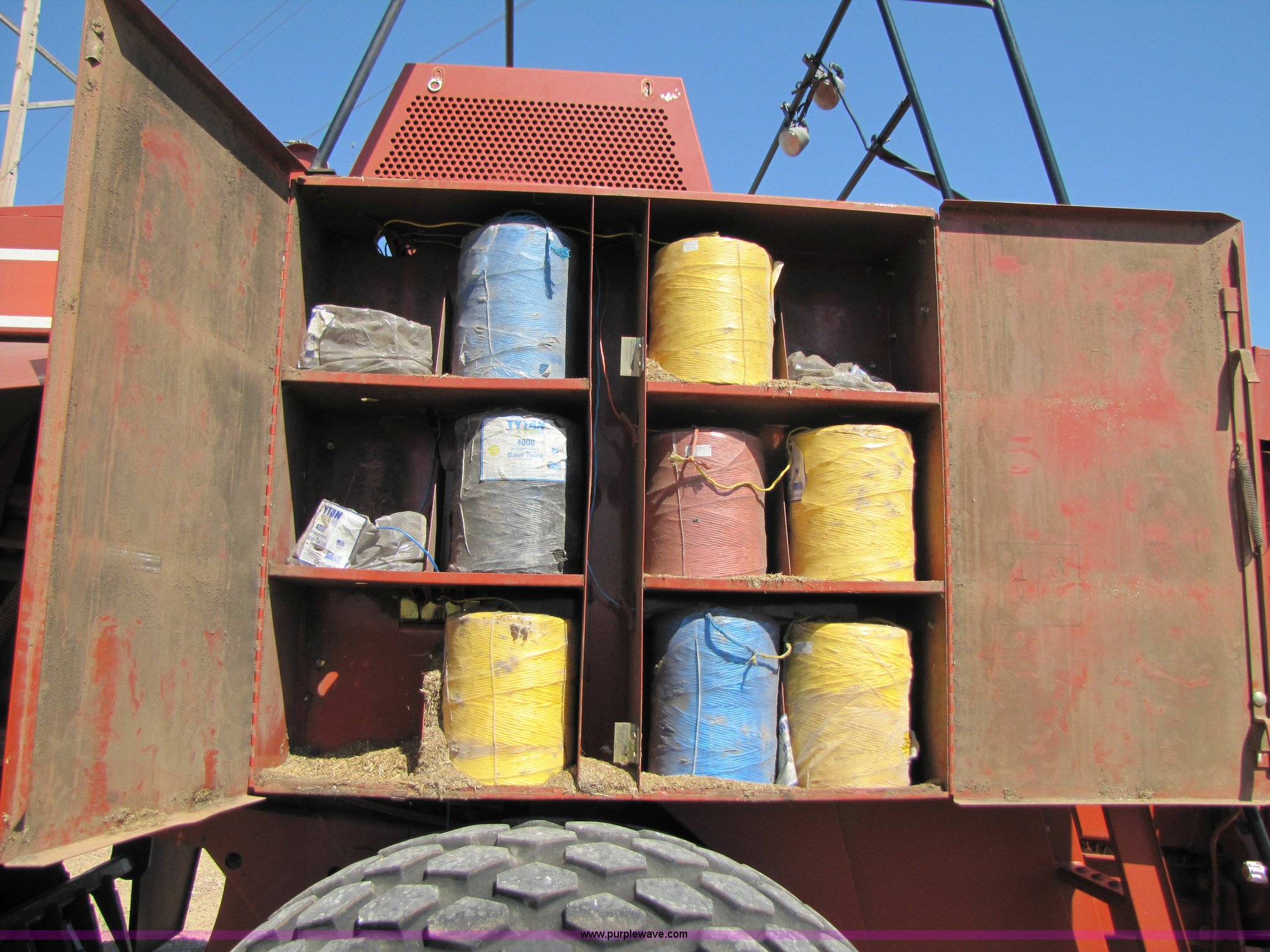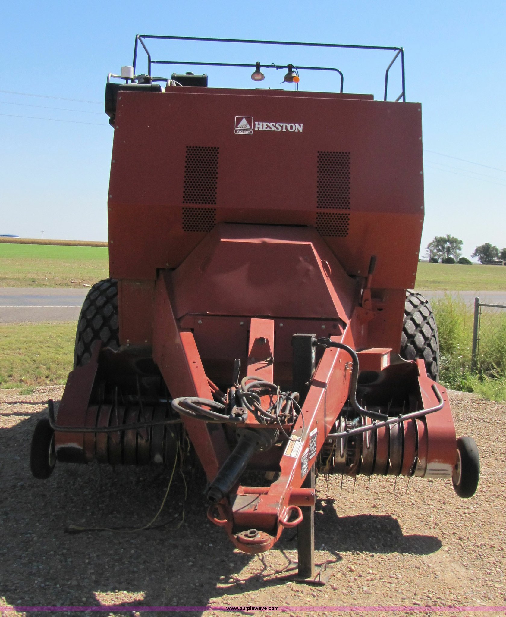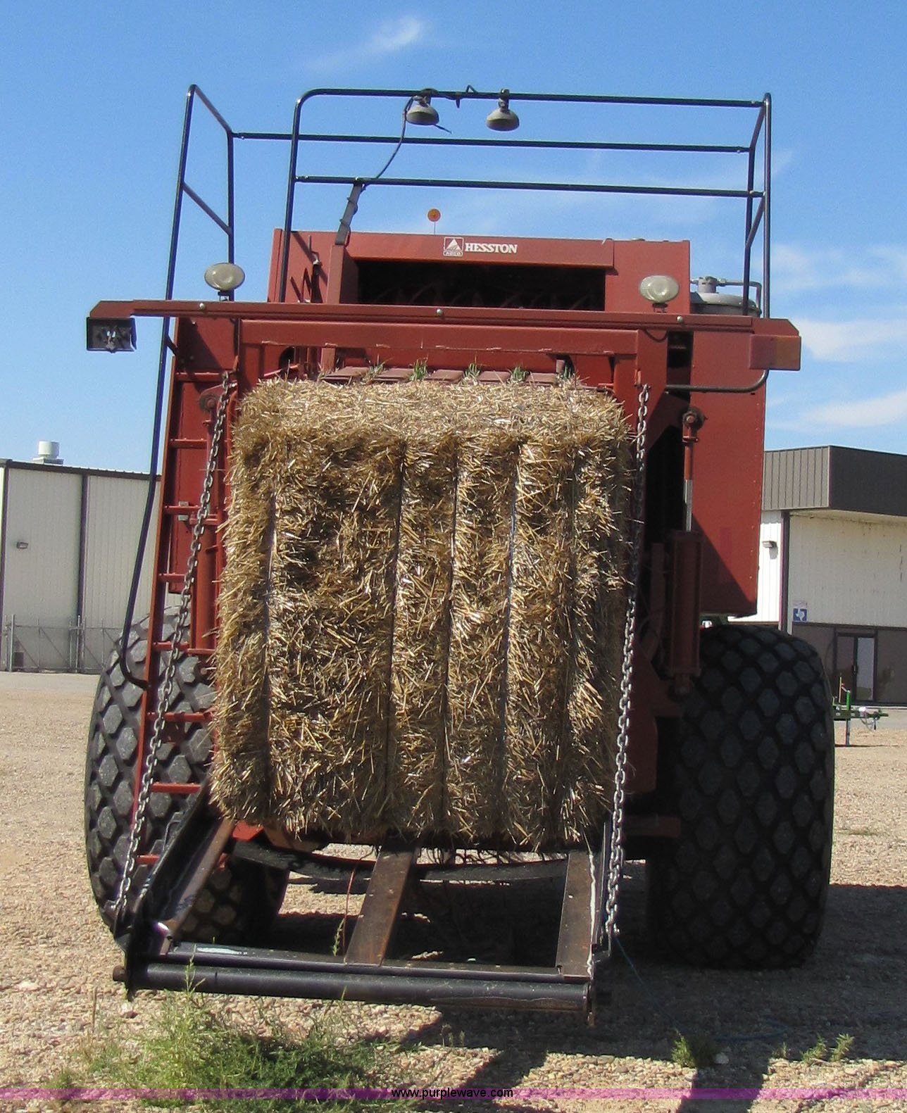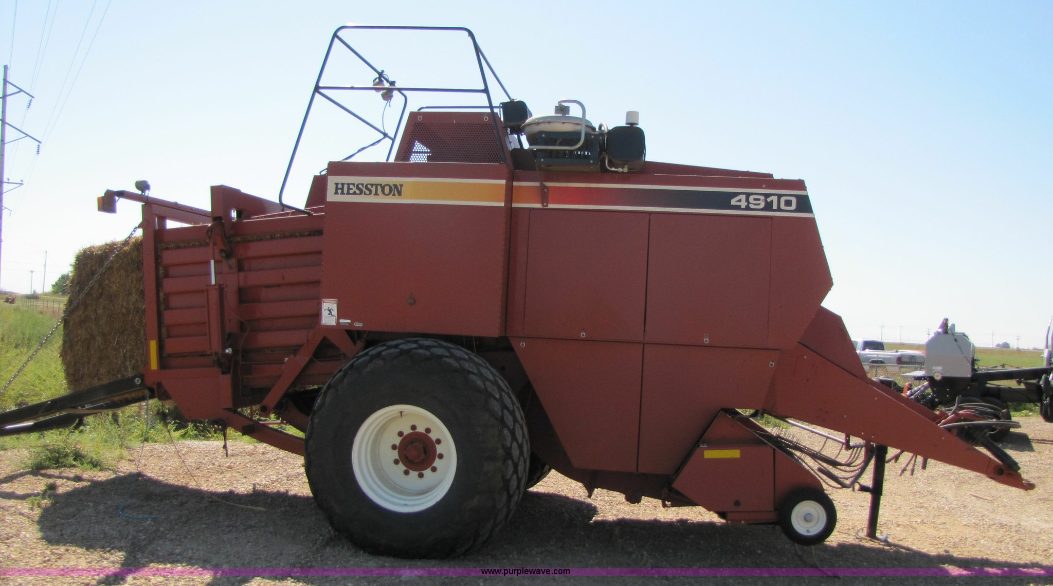 Purple Wave is selling a used Square Baler in Texas. This item is a 2003 Hesston 4910 square baler with the following: Approx 16,000 bales, 1000 PTO, Auto lube system, Bale chute, Six double knot knotters, 24 ball twine storage, Knotter fan, Work lights, Road lights, 89" pickup width, Up to 108" bale length, 28Lx26 16 ply turf tires, Monitor, Serial HM91547
